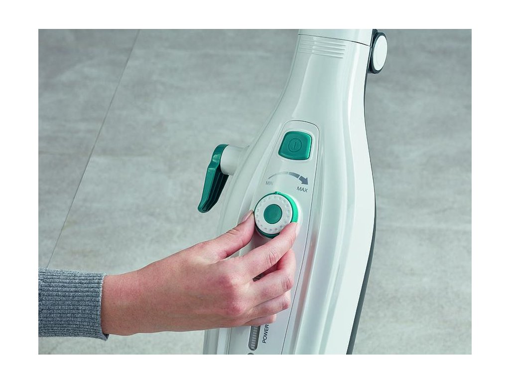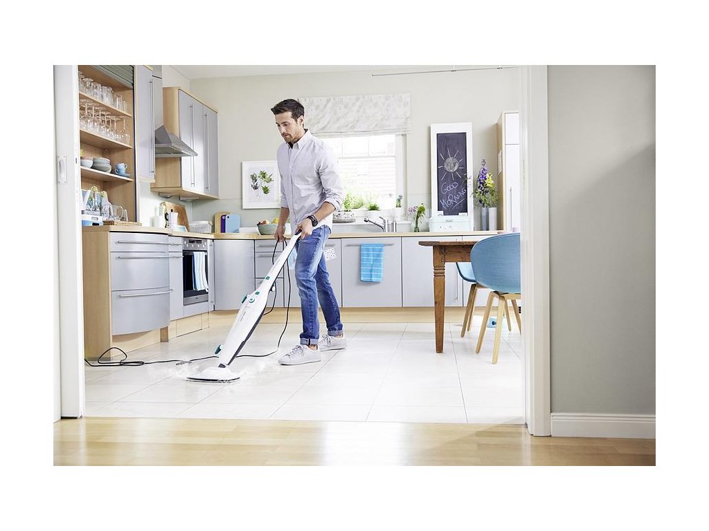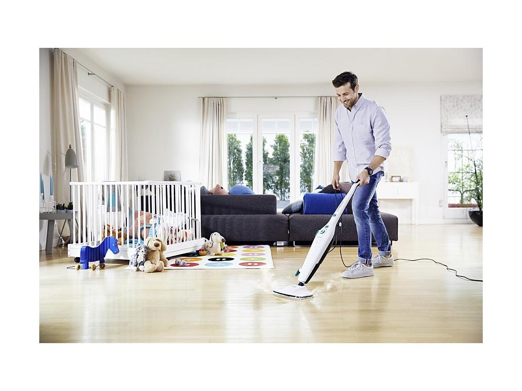 Dôkladné hygienické čistenie dlaždíc, kamenných podláh a lakovaných drevených podláh, individuálne nastaviteľné množstvo pary pre všetky typy podláh, 6 trysiek na efektívne čistenie, vysoká teplota pary odstráni 99,99 % baktérií - úplne bez použitia chémie, doba zahrievania cca 30 sekúnd, veľká nádrž na vodu (550 ml) pre extra dlhú prevádzku, savé mikrovlákno pre perfektnú absorpciu nečistôt, materiál: 90% polyester, 10% polyamid - pred použitím vyperte, čistič s vodným filtrom, vrátane stierky na koberce na osvieženie vzhľadu kobercov, sklopné madlo pre ľahké uskladnenie, extra dlhý kábel 6,5 m, váha cca 2,8 kg.