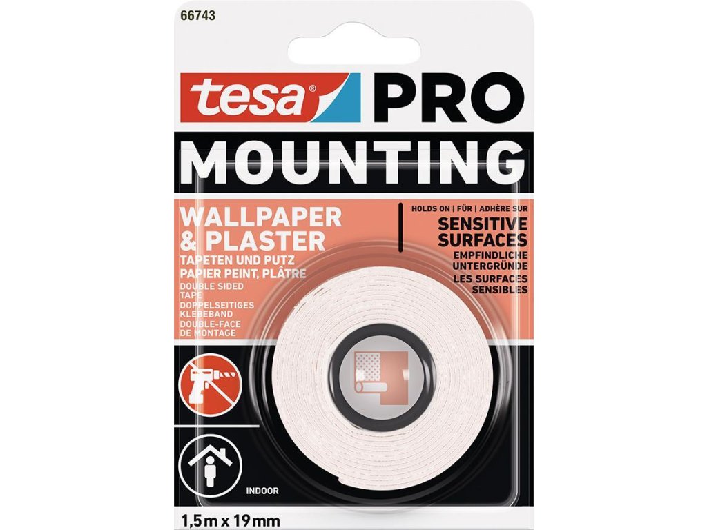 - Trvácne a spoľahlivé upevnenie bez poškodenia steny: Montážna páska tesa PRO Mounting Wallpaper & Plaster posiela skrutky, hmoždinky aj klince do starého železa – na rýchlu a jednoduchú montáž bez použitia náradia