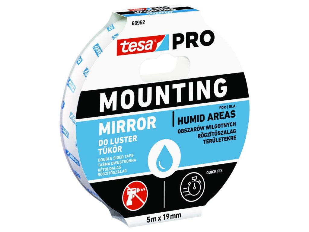 Penová obojstranná páska ponúka vynikajúce lepiace schopnosti aj vo vlhkých priestoroch ako sú kúpeľne. Dokáže udržať zrkadlá až do rozmerov 70 x 70 cm s hrúbkou do 4 mm. Vďaka montážnej páske tesa PRO Mounting Mirror nie je potrebné použitie skrutiek, hmoždiniek alebo klincov – upevnenie ťažších predmetov nebolo nikdy jednoduchšie! Vynikajúca priľnavosť na hladkom povrchu. Vysoká odolnosť voči starnutiu a vlhkosti. Rozmer: 5 m x 19 mm.