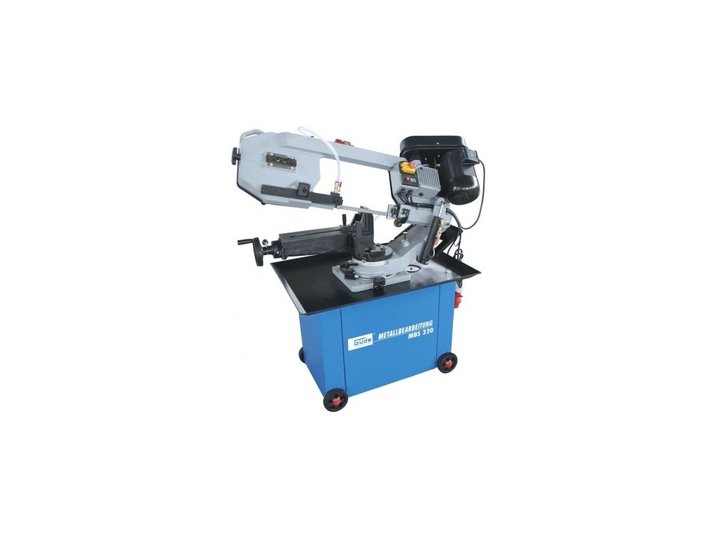 Pásová píla na kov s konštrukciou z liatiny. 10-násobné vedenie pílového pásu s guľôčkovými ložiskami. Rýchloupínací zverák s excentrickým upínacím systémom, zarážka obrobku, bimetalový pílový pás. Chladiace zariadenie, automatický koncový vypínač. Kefka na piliny. Otočný rám píly. Pásová píla na kov MBS 220
