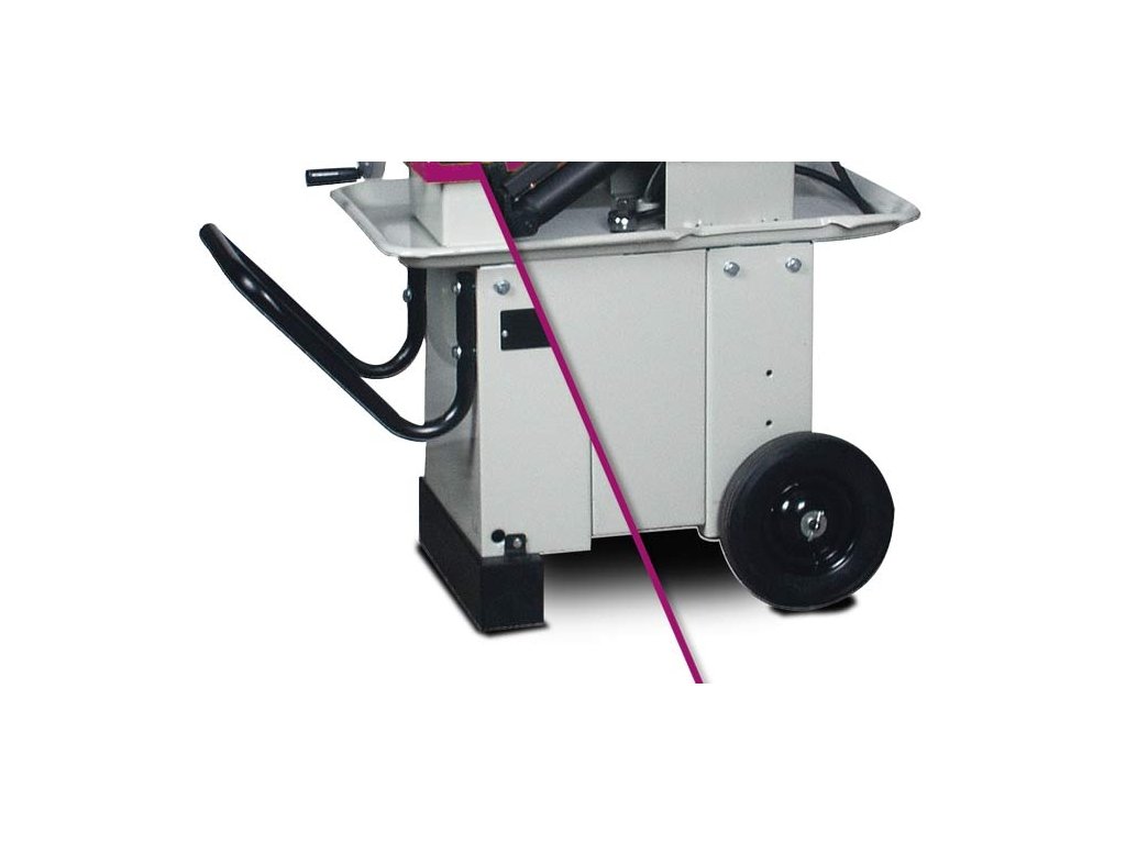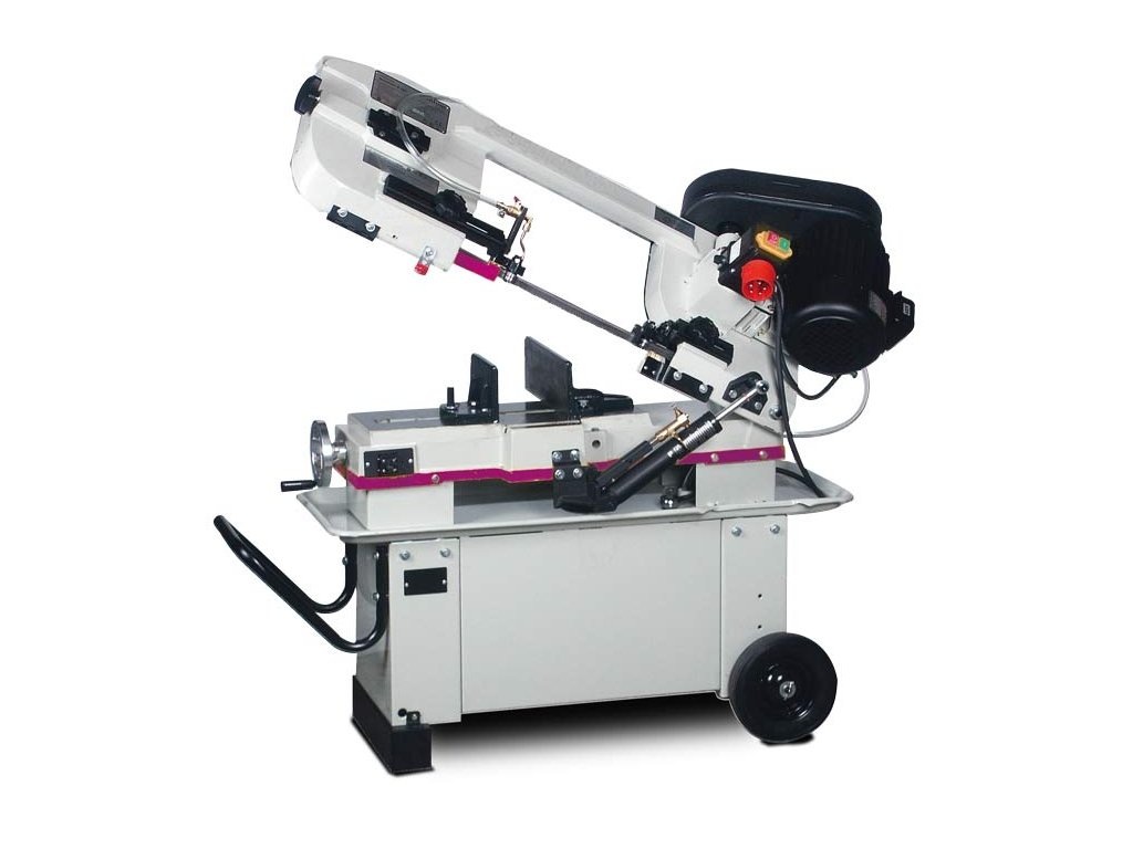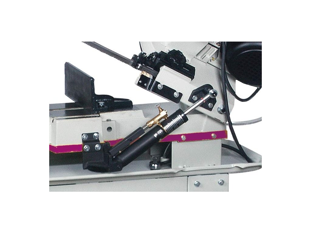 Masivní pásová pila na kov s plynulým hydraulickým spouštěním rámu. Změna rychlosti pilového pásu se provádí přestavením klínového řemene.