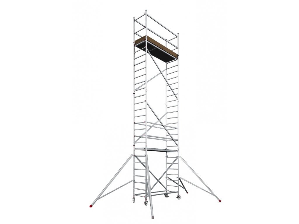 Hliníková pojízdná pracovní plošina EUROFORM šířky podlahy 0,72 m a délkou podlahy 2,06 m. Plošinu lze umístit do maximální výšky 6,12 m.