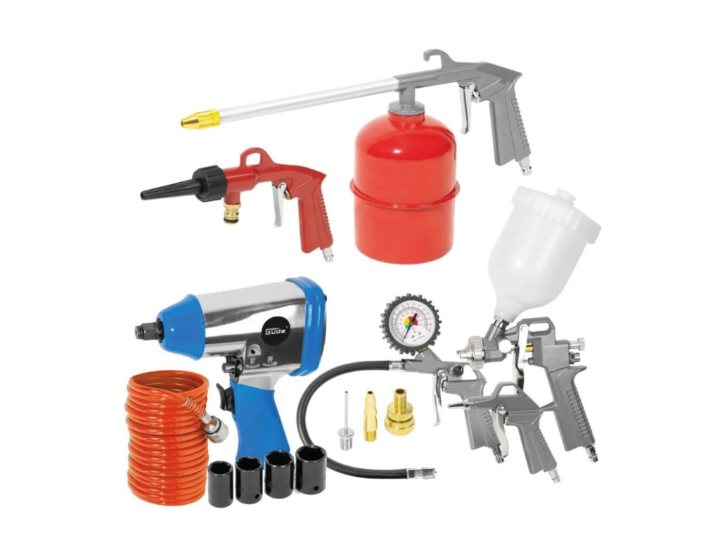 Sada pneumatického náradia obsahuje rázový uťahovák 1/2", nadstavce 15, 17, 19, 21 mm, špirálovú hadicu, striekaciu pištoľ na farby, striekaciu pištoľ na olej, vyfukovaciu pištoľ, hustilku pneumatík s manometrom, špičky na fúkanie lôpt, pištoľ na vodu.Rázový uťahovák 1/2"Prípojný závit: 1/4"Otáčky pri voľnobehu: 8000 ot./min.Pracovný tlak: 6 barSpotreba vzduchu: 310 - 500 l/min.Maximálny krútiaci moment: 310 NmUpínanie náradia: 1/2"Nadstavce: 15, 17, 19, 21 mmDoplňkové parametry