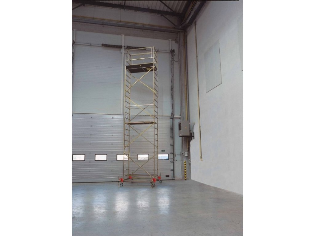 Ocelové pojízdné lešení s šířkou podlahy 0,76 m a maximální výškou umístění podlahy 4,80 m. Na lešení může pracovat jen jedna osoba.