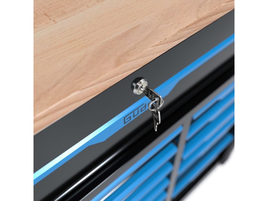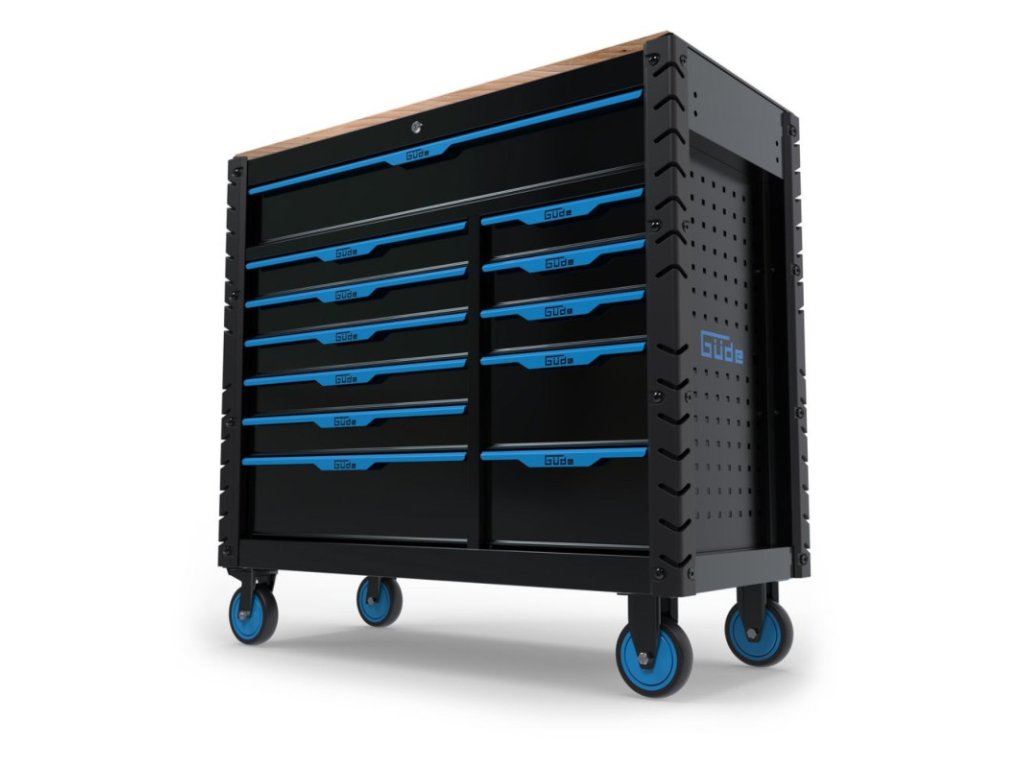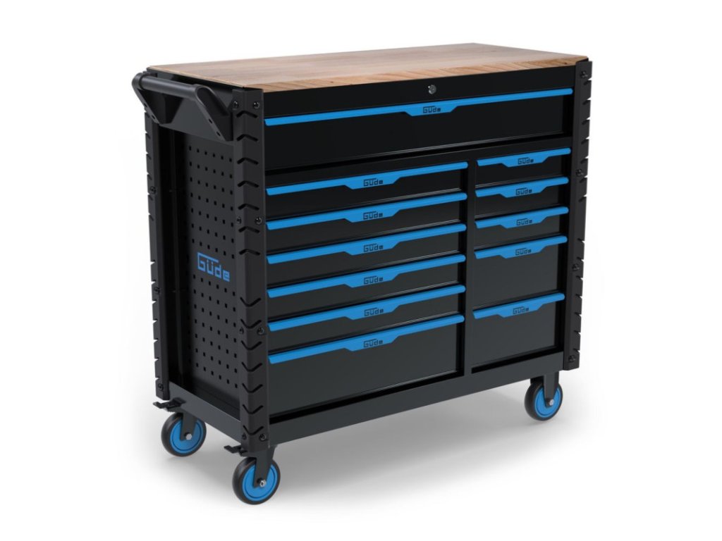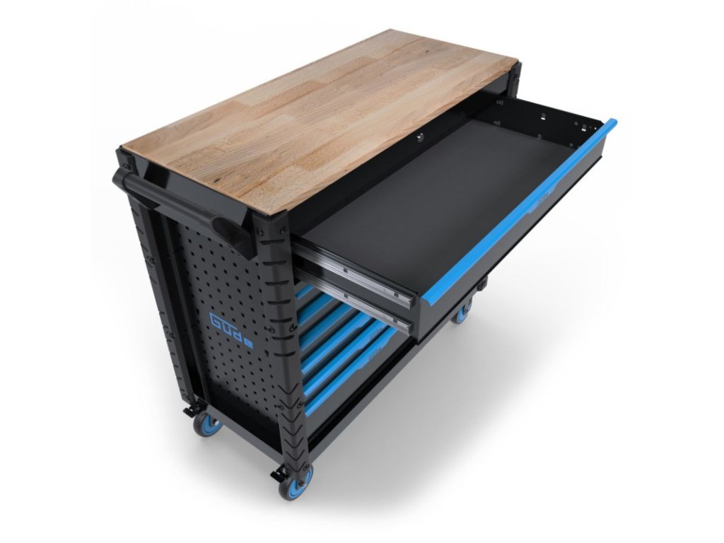 Kombinácia mobilného pracovného stola a vozíka na náradie je praktická pre domácich majstrov a profesionálov, ktorých pracovisko nemusí byť nevyhnutne stacionárne. Extra veľký úložný priestor vďaka 12-tim zásuvkám rôznych veľkostí. Zásuvky s pogumovaným úchytom a plným vysúvaním, osadené na kvalitných guľôčkových ložiskách. Protišmykové alebo čalúnené podušky vo všetkých zásuvkách. Centrálne uzamykanie zásuviek s dvoma kľúčmi. Pevná a odolná pracovná doska z kaučukového dreva. Štyri veľké PVC kolieska pre vysokú flexibilitu premiestňovania. Dva kolieska s brzdou pre bezpečnosť. Perforované bočné steny na dodatočné zavesenie náradia. Pevná oceľová konštrukcia s povrchovou úpravou práškovaním. S ochranou hrán a praktickým držadlom na premiestňovanie. Držadlo na premiestňovanie a kolieska s brzdou môžu byť namontované na oboch stranách. Stôl sa dodáva zmontovaný (s výnimkou koliesok).Maximálna nosnosť: 400 kgŠírka pracovnej dosky: 1050 mmHĺbka pracovnej dosky: 480 mmHrúbka pracovnej dosky: 20 mmPracovná výška: 1000 mmVeľká zásuvka:Počet: 1 ksŠírka zásuvky: 920 mmVýška zásuvky: 120 mmHĺbka zásuvky: 420 mmNosnosť zásuvky: 30 kgStredná zásuvka:Počet: 6 ksŠírka zásuvky: 578 mmVýška zásuvky: 5 x 75 / 1 x 155 mmHĺbka zásuvky: 420 mmNosnosť zásuvky: 30 kgMalá zásuvka:Počet: 5 ksŠírka zásuvky: 315 mmVýška zásuvky: 3 x 75 / 2 x 155 mmHĺbka zásuvky: 420 mmNosnosť zásuvky: 30 kgPerforácia bočných stien: 10 x 10 mmRozostup otvorov bočných stien: 38 x 38 mmRozmery (ŠxHxV): 1125 x 480 x 1000 mmHmotnosť: 88,5 kg/93 kgDoplňkové parametry
