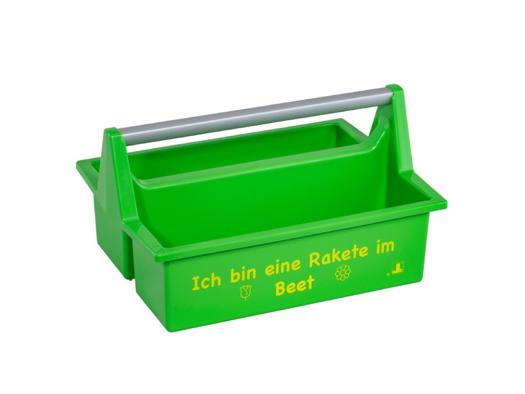 Prenosná prepravka s nápisom Ich bin eine Rakete im Beet (som raketa na záhone). Viacúčelová plastová prepravka na náradie s vtipným nápisom v zelenej farbe na prenášanie náradia a každodenných potrieb v domácnosti. Prenosná prepravka s nápisom Ich bin eine Rakete im Beet (som raketa na záhone). Viacúčelová plastová prepravka na náradie s vtipným nápisom v zelenej farbe na prenášanie náradia a každodenných potrieb v domácnosti, ako darček pre partnera, pre ambicióznych záhradníkov, domácich majstrov, ale aj remeselníkov. Prinesie radosť do pochmúrneho každodenného života. Dve veľké priehradky ponúkajú úložný priestor na náradie a potrebné veci. Praktická stupnica v cm/palcoch na priehradkách. Ergonomická rukoväť z hliníka. S veľmi kvalitnou sieťotlačou, vyrobená podľa normy DIN ISO 20457. Dodáva sa bez vyobrazeného obsahu. Materiál: PP (polypropylén), hliník Farba: zelená Využiteľné rozmery každej priehradky (DxŠxV): 325 x 100 x 110 mm Celkové rozmery (DxŠxV): 395 x 290 x 215 mm Hmotnosť: 570 gDoplňkové parametry
