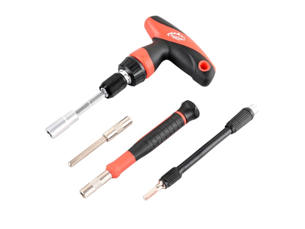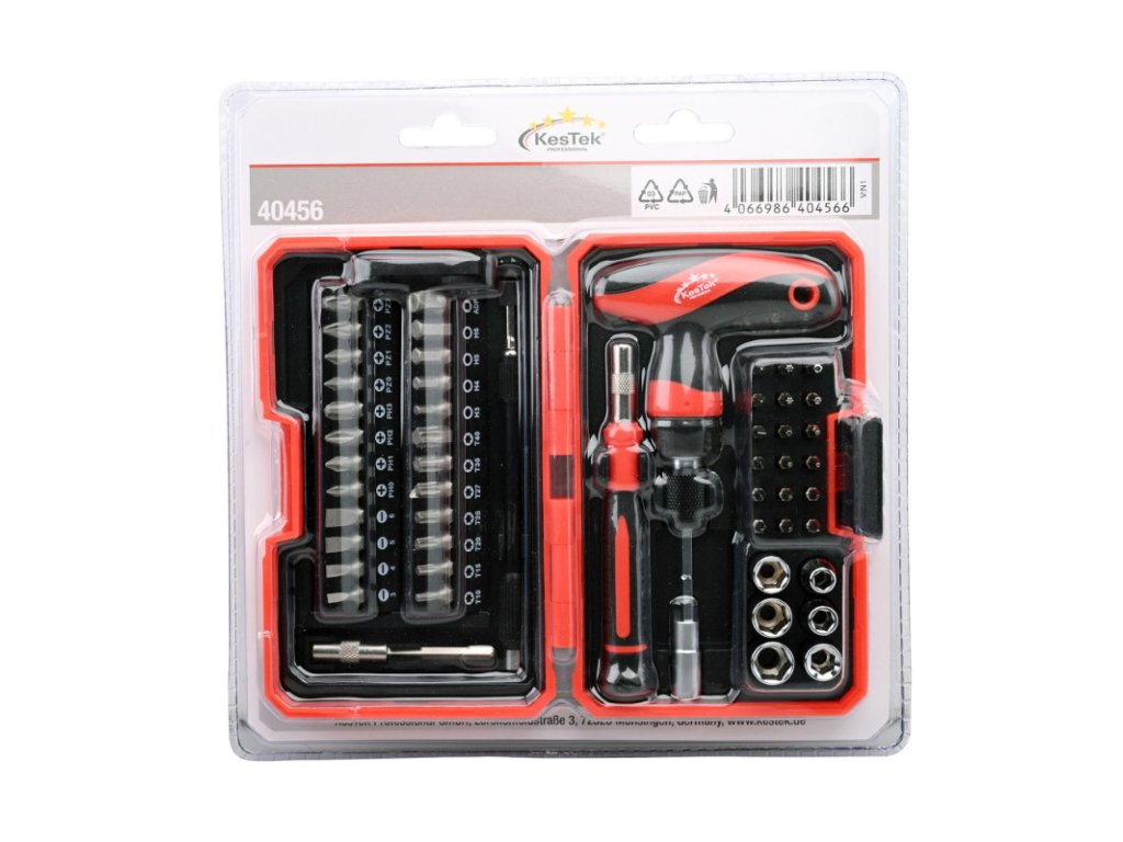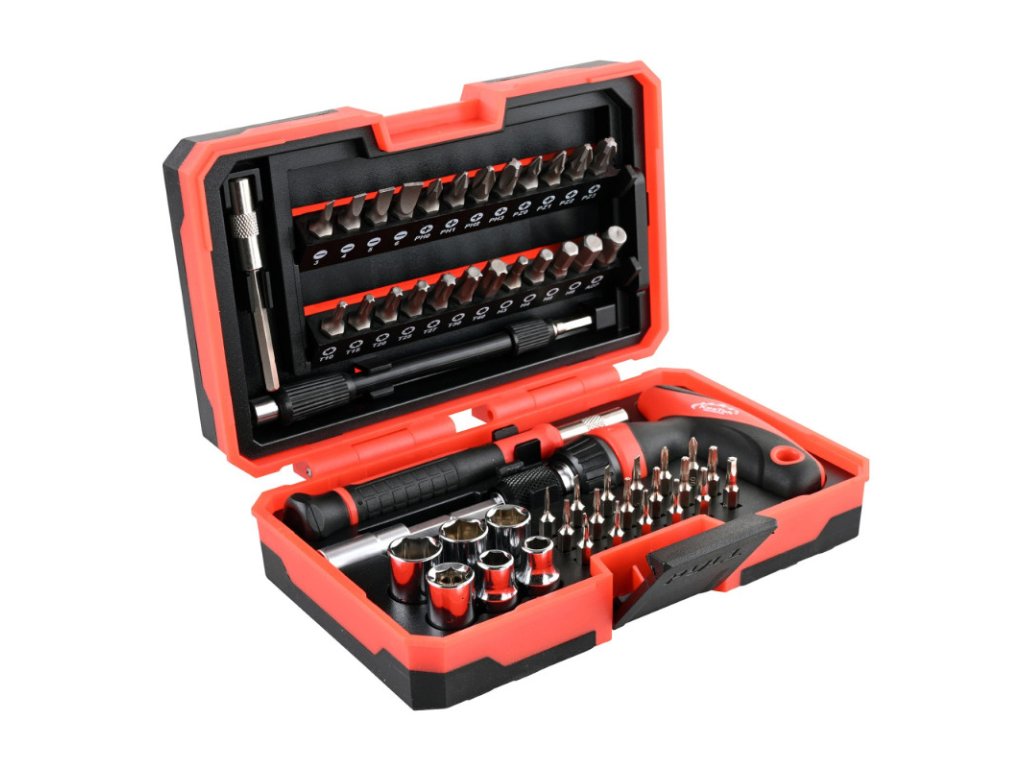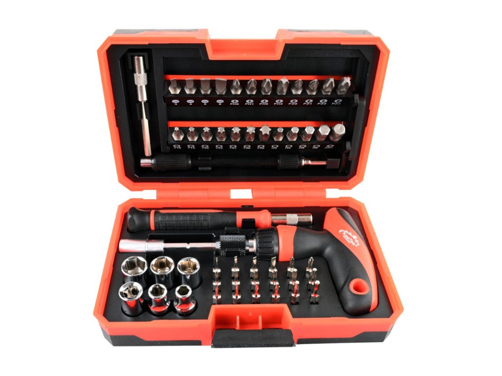 Račňový skrutkovač s T-rukoväťou, reverzibilný vľavo/vpravo a uzamykateľný, na uvoľňovanie a uťahovanie skrutiek rôznych veľkostí a tvarov. Račňový skrutkovač s T-rukoväťou, reverzibilný vľavo/vpravo a uzamykateľný, na uvoľňovanie a uťahovanie skrutiek rôznych veľkostí a tvarov. Sada obsahuje rýchlovýmenný magnetický držiak bitov s 3 nastaveniami hĺbky, pevný a ohybný predlžovací hriadeľ, adaptér na nástrčné kľúče, 23 bitov 1/4", 6 šesťhranných nástrčných kľúčov, skrutkovač na jemnú mechaniku, 18 bitov na jemnú mechaniku. Vďaka predĺženiam umožňuje jednoduché použitie aj na ťažko dostupných miestach. Uložené v praktickom boxe. Materiál: chróm-vanádiová oceľ Dĺžka račne s T-rukoväťou: 85 mm Dĺžka rýchlovymeniteľného magnetického držiaka s 3 nastaveniami hĺbky: 100 mm Veľkosti bitov: SL3, SL4, SL5, SL6, PH0, PH1, PH2, PH3, PZ0, PZ1, PZ2, PZ3, T10, T15, T20, T25, T27, T30, T40, H3, H4, H5, H6 Adaptér: 1/4" šesťhran na 1/4" štvorhran pre 1/4" nástrčné kľúče Veľkosti nástrčných kľúčov: 5, 6, 7, 8, 9 a 10 mm Dĺžka skrutkovača na jemnú mechaniku: 110 mm Dĺžka pevného predĺženia skrutkovača na jemnú mechaniku: 60 mm Dĺžka flexibilného predĺženia skutkovača na jemnú mechaniku 116 mm Veľkosti bitov na jemnú mechaniku: SL1, SL1.5, SL2, SL2.5, PH000, PH00, T4, T5, T6, T7, T8, T9, H0.7, H0.9, H1.3, H1.5, H2, H2.5 Celkové rozmery boxu: 152 x 100 x 47 mm Hmotnosť sady: 575 gDoplňkové parametry