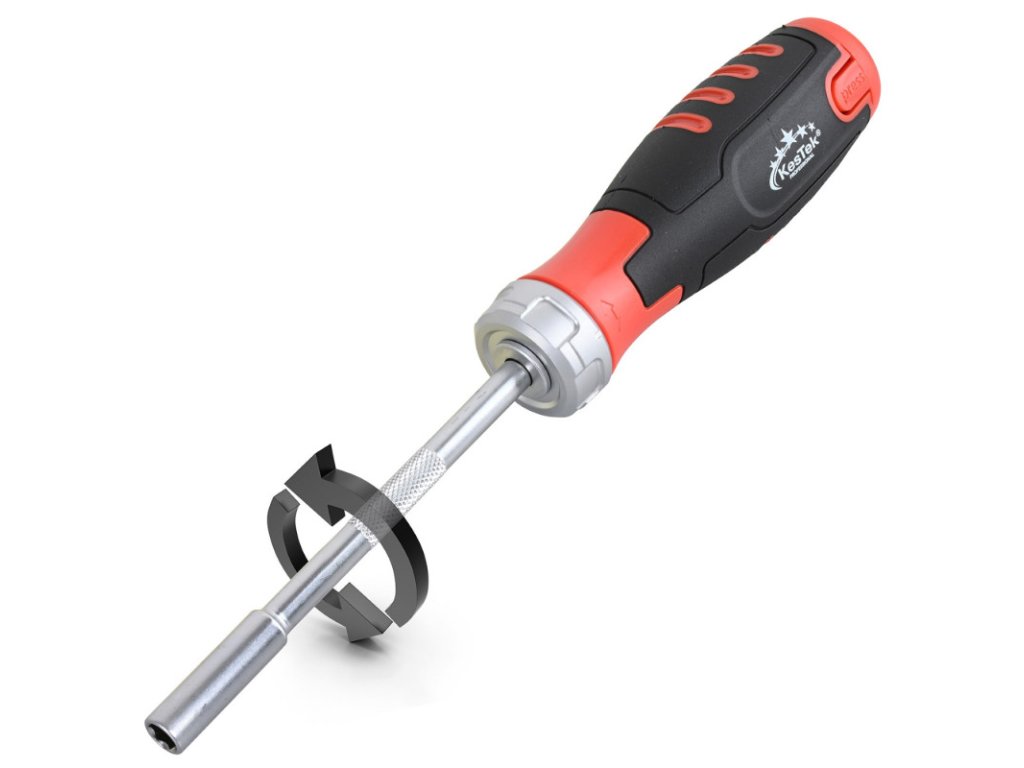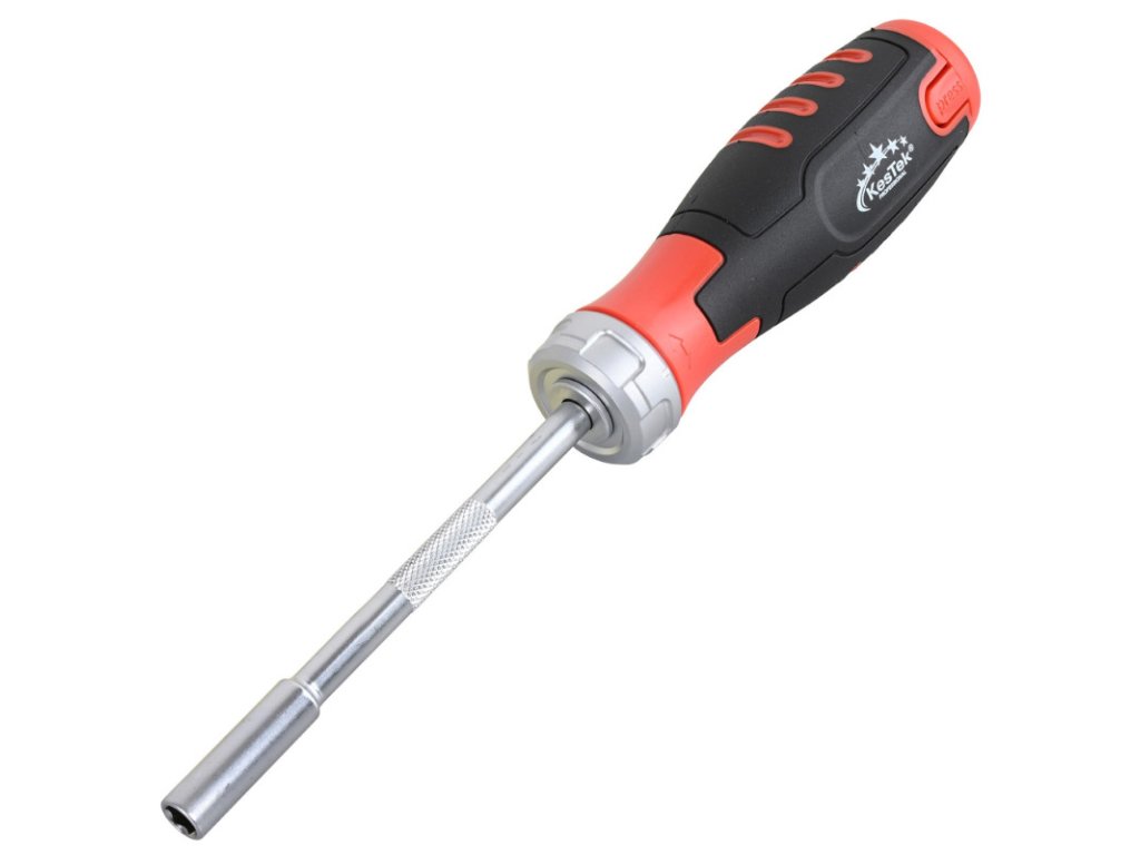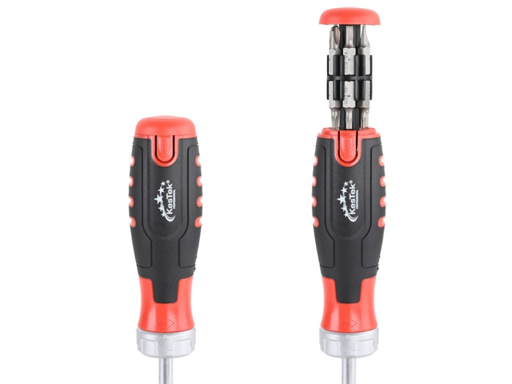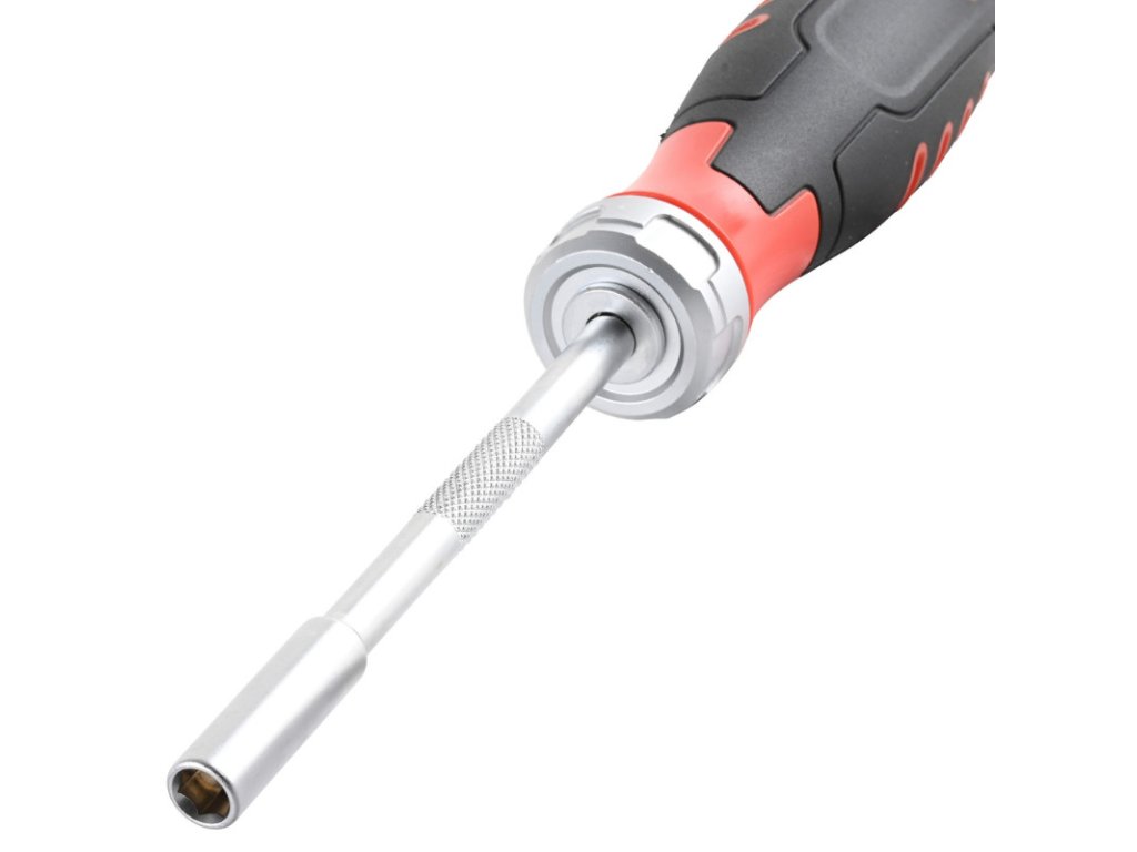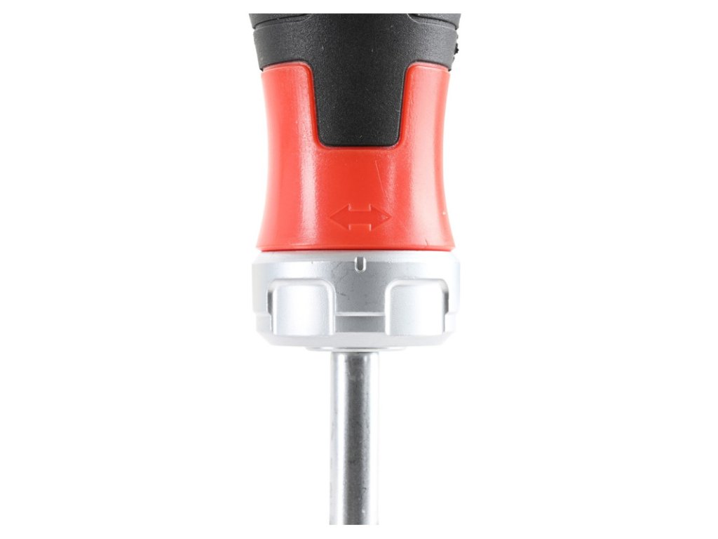 Skrutkovač s račňovou funkciou, so zásobníkom s 12 bitmi CrV. Ušetrite miesto v skrinke s náradím, na pracovnom stole a v zásuvke. Vždy máte po ruke ten správny bit pre takmer všetky štandardné skrutky. Ergonomická viackomponentná rukoväť s integrovaným automatickým zásobníkom bitov. Skrutkovač s račňovou funkciou, so zásobníkom s 12 bitmi CrV. Ušetrite miesto v skrinke s náradím, na pracovnom stole a v zásuvke. Vždy máte po ruke ten správny bit pre takmer všetky štandardné skrutky. Ergonomická viackomponentná rukoväť s integrovaným automatickým zásobníkom bitov. Odnímateľný 110 mm driek s rýchlou rotačnou zónou a 1/4" šesťhranným upínaním s magnetom. Račňová funkcia, nastaviteľné otáčanie vľavo/vpravo a aretácia. Materiál: chróm-vanádiová oceľ Rukoväť: 2-zložkový plast Dĺžka drieku: 110 mm Bity: SL4, SL5, SL6, PH1, PH2, PH3, T10, T15, T20, H3, H4, H5 Farba: čierna, červená Celkové rozmery: 240 x 38 x 38 mm Hmotnosť sady: 270 gDoplňkové parametry