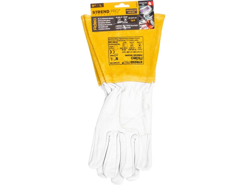 Celokožené zváračské rukavice Strend Pro Industrial Adeo. Dlaň a chrbát sú vyrobené z bielej kozej lícovej kože. Manžeta s gumičkou sú vyrobené z hovädzej štiepenky. Spĺňajú normu EN ISO 21420:2020 (cat II).
