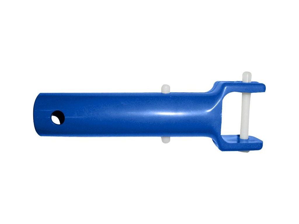 Táto rukoväť je vyrobená z kvalitného materiálu ABS+POM, čo sú odolné plasty bežne používané v aplikáciách vyžadujúcich dlhodobú odolnosť voči vlhkosti a mechanickej záťaži. Konštrukcia zahŕňa bočné plastové kolíky, ktoré zabezpečujú pevné a stabilné spojenie s násadou vysávača bez rizika samovoľného uvoľnenia počas čistenia. Otvor na konci rukoväte umožňuje jednoduché a rýchle nasadenie na štandardné bazénové príslušenstvo.