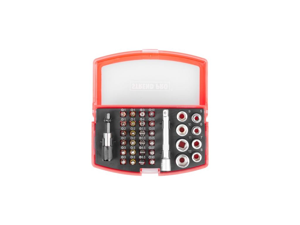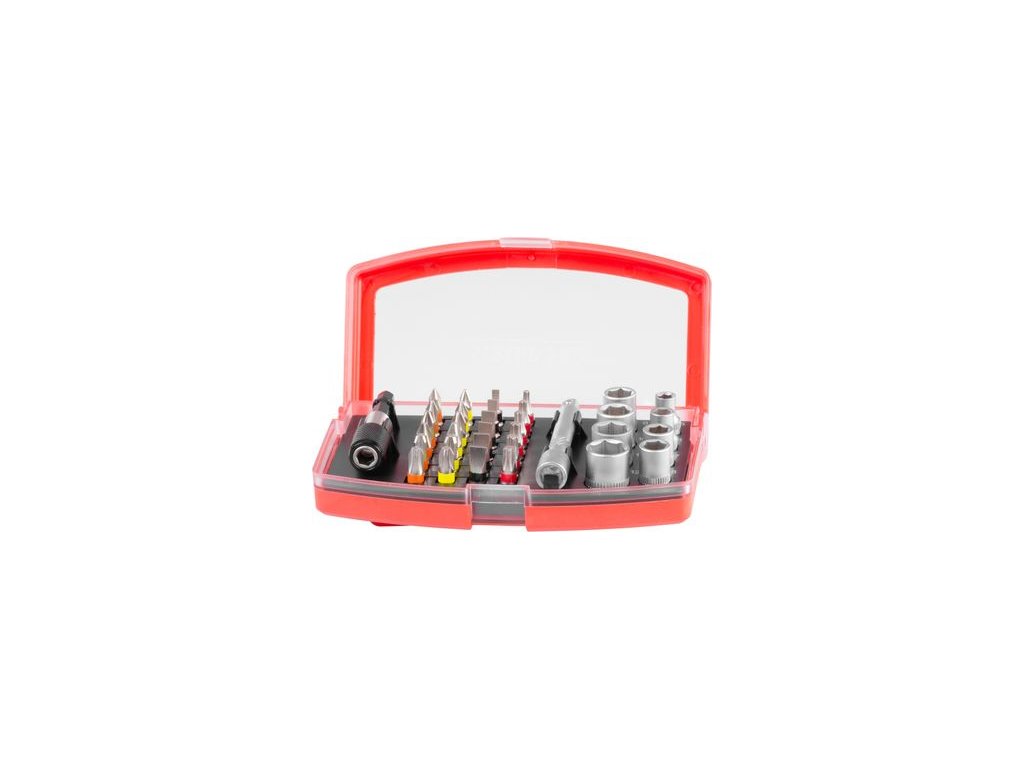 24x bit 25mm, S2: PH: 1,1.2,2,3.3 PZ: 1,1.2,2,3.3 SL: 3,4,5,5.5,6.5,6.6 T: 10,15, 20, 25, 27, 30 8x hlavica, Cr-V: 5,6,7,8,9,10,11,12 mm 1x 75mm držiak na bity 1x mag. adaptér na bityDoplňkové parametry