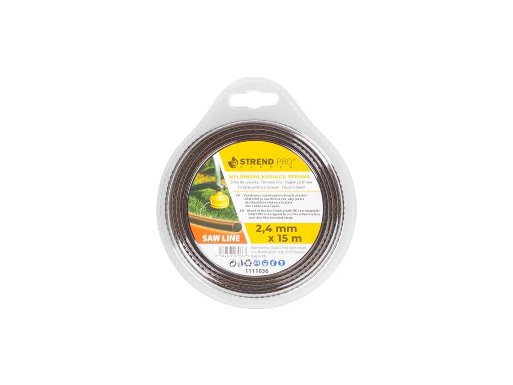 Nylónová kosiaca struna Strend Pro Saw Line je navrhnutá tak, aby rezala ako flexibilné vlákno a krájala ako zúbkovaná čepeľ. Je vyrobená z vysokopevnostných plastov. Dĺžka je 15 metrov, šírka 2,4 mm.