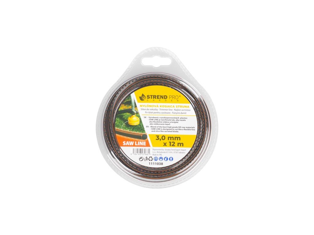 Nylónová kosiaca struna Strend Pro Saw Line je navrhnutá tak, aby rezala ako flexibilné vlákno a krájala ako zúbkovaná čepeľ. Je vyrobená z vysokopevnostných plastov. Dĺžka je 12 metrov, šírka 3 mm.
