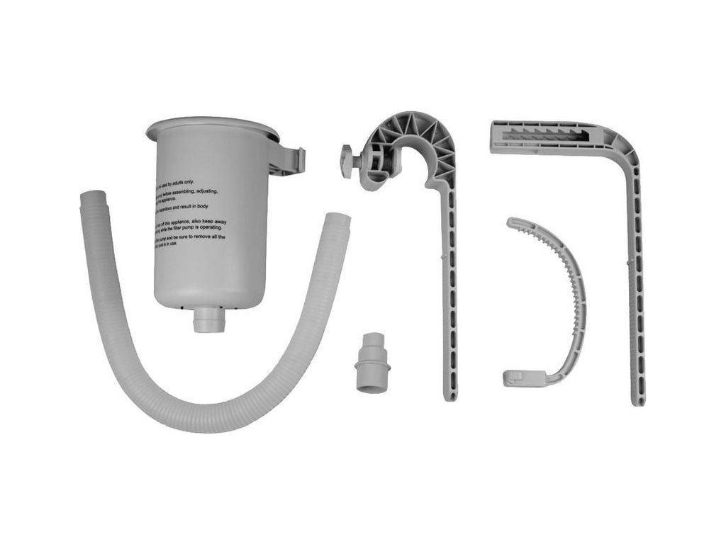 Súčasťou sady je všetko, čo potrebujete pre rýchlu a bezproblémovú inštaláciu. Balenie obsahuje telo skimmera s košíkom na zachytávanie hrubých nečistôt, flexibilnú hadicu, spojovací adaptér a upevňovací hák s držiakom, ktorý umožňuje pevné prichytenie na stenu bazéna bez potreby náradia. Vďaka tomuto systému je montáž aj demontáž skimmera rýchla a jednoduchá.