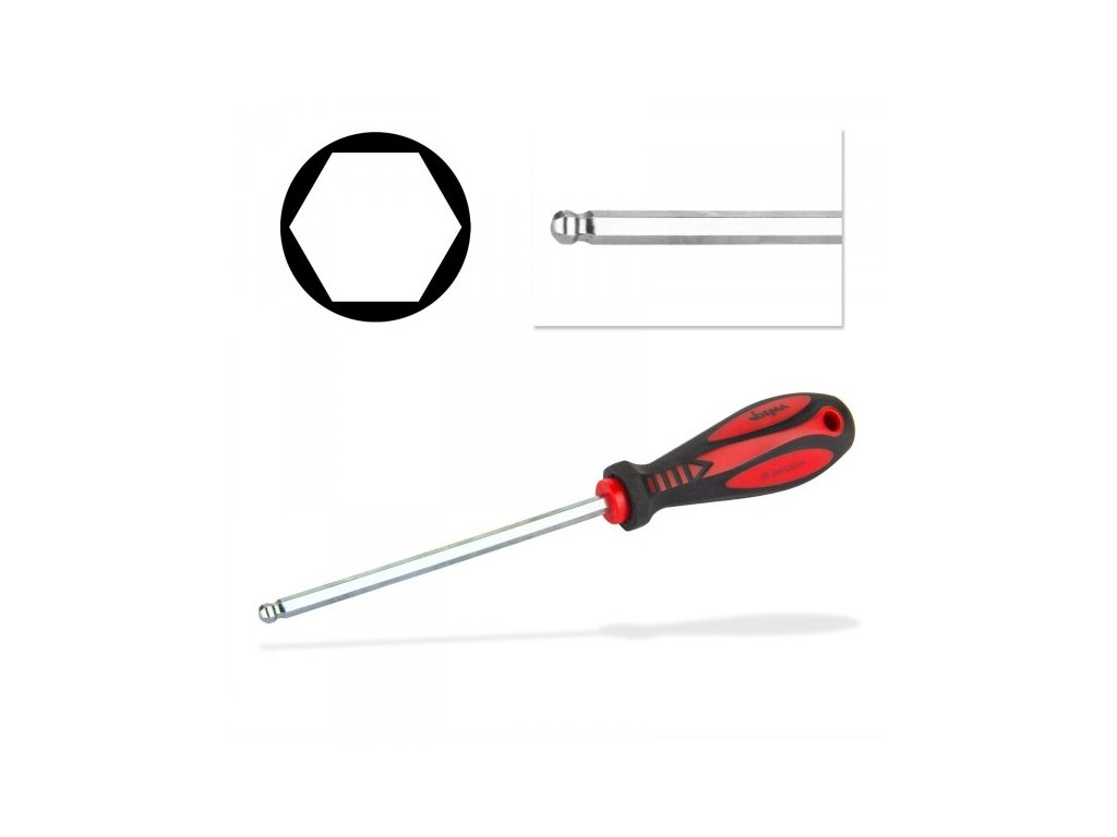 Skrutkovač so šesťhrannou guľovou hlavou z kvalitnej chrómovo-vanádiovej ocele s magnetickým hrotom. Pevná ergonomicky tvarovaná plastová rukoväť s protišmykovou úpravou. Praktické očko na zavesenie skrutkovača. Kvalitná chróm-vanádiová oceľ