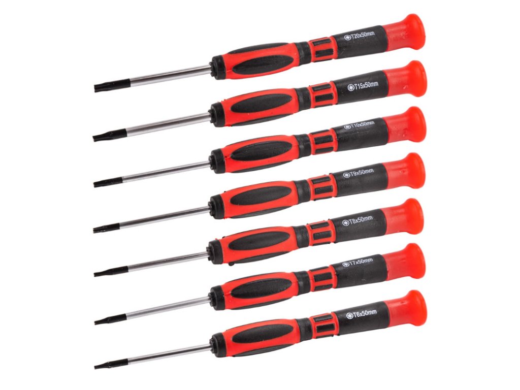 Skrutkovače z vysoko kvalitnej chróm-vanádiovej ocele, hroty sú magnetické, čo výrazne uľahčuje vkladanie skrutiek a zabraňuje ich strate. Ideálne pre všetky jemné a presné práce. Každý skrutkovač má otočný driek, ktorý výrazne uľahčuje skrutkovanie tlakom dlane. Skrutkovače z vysoko kvalitnej chróm-vanádiovej ocele, hroty sú magnetické, čo výrazne uľahčuje vkladanie skrutiek a zabraňuje ich strate. Ideálne pre všetky jemné a presné práce. Každý skrutkovač má otočný driek, ktorý výrazne uľahčuje skrutkovanie tlakom dlane. Veľkosti: T6 / T7 / T8 / T9 / T10 / T15 / T20 Driek: chróm-vanádiová oceľ Rukoväť: PVC Farba: čierna, červená Dĺžka drieku: 50 mm Celková dĺžka: 150 mm Rozmery boxu: 187 x 134 x 25 mm Hmotnosť sady: 217 gDoplňkové parametry