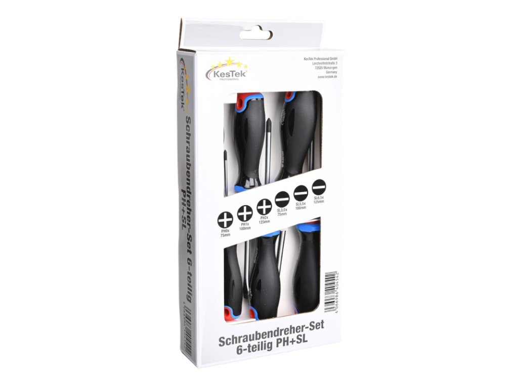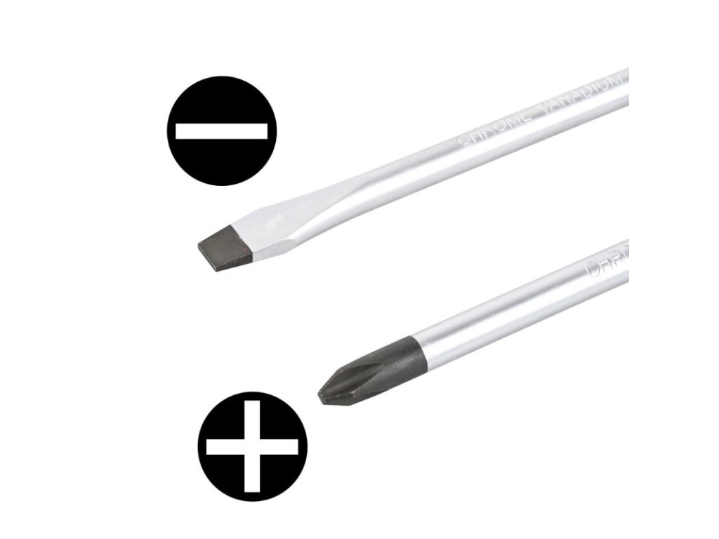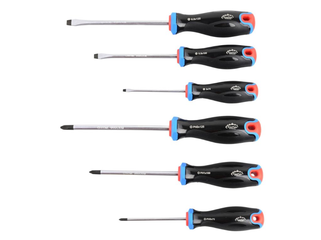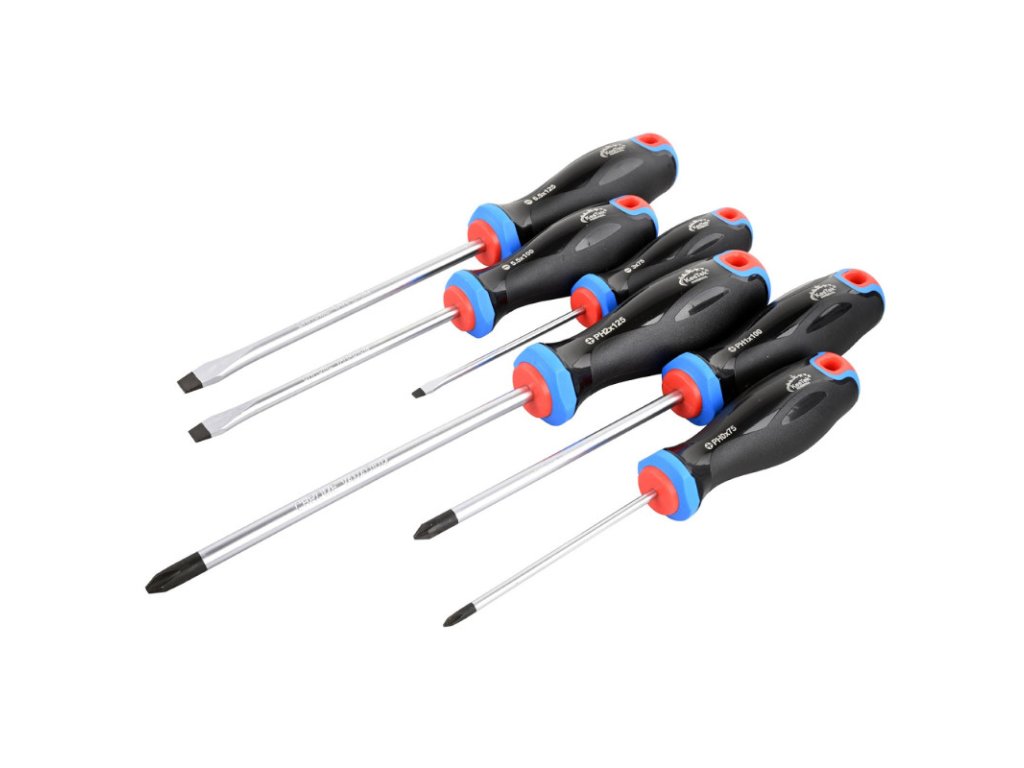 Skrutkovače z vysoko kvalitnej chróm-vanádiovej ocele, hroty sú magnetické, čo výrazne uľahčuje vkladanie skrutiek a zabraňuje ich strate. Ergonomická dvojzložková rukoväť s povrchovou úpravou Black Line dobre padne do ruky a umožňuje pohodlnú prácu bez únavy. Skrutkovače z vysoko kvalitnej chróm-vanádiovej ocele, hroty sú magnetické, čo výrazne uľahčuje vkladanie skrutiek a zabraňuje ich strate. Ergonomická dvojzložková rukoväť s povrchovou úpravou Black Line dobre padne do ruky a umožňuje pohodlnú prácu bez únavy. Otvor v rukoväti zaisťuje úhľadné zavesenie na stenu s náradím alebo sa dá použiť ako ďalší pákový bod. Krížové skrutkovače: PH0x75 mm / celková dĺžka 163 mm PH1x100 mm / celková dĺžka 198 mm PH2x125 mm / celková dĺžka 233 mm Ploché skrutkovače: SL3x75 mm / celková dĺžka 163 mm SL5.5x100 mm / celková dĺžka 198 mm SL6.5x125 mm / celková dĺžka 233 mm Driek: chróm-vanádiová oceľ Rukoväť: 2-zložkový plast Farba: čierna, červená, modrá Hmotnosť sady: 380 gDoplňkové parametry