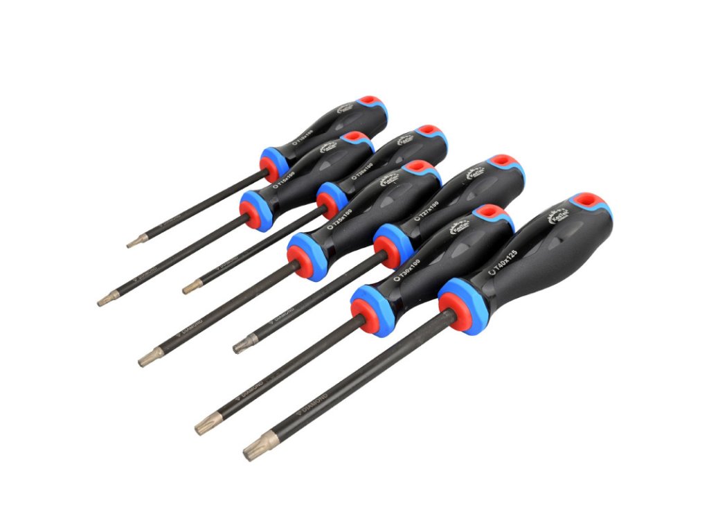 Skrutkovače z vysoko kvalitnej chróm-vanádiovej ocele, hroty majú vysoko kvalitný diamantový povlak pre maximálnu presnosť a odolnosť, sú magnetické, čo výrazne uľahčuje vkladanie skrutiek a zabraňuje ich strate. Skrutkovače z vysoko kvalitnej chróm-vanádiovej ocele, hroty majú vysoko kvalitný diamantový povlak pre maximálnu presnosť a odolnosť, sú magnetické, čo výrazne uľahčuje vkladanie skrutiek a zabraňuje ich strate. Ergonomická dvojzložková rukoväť s povrchovou úpravou Black Line dobre padne do ruky a umožňuje pohodlnú prácu bez únavy. Otvor v rukoväti zaisťuje úhľadné zavesenie na stenu s náradím alebo sa dá použiť ako ďalší pákový bod. Skrutkovače Torx: TX10x100 mm / celková dĺžka 198 mm TX15x100 mm / celková dĺžka 198 mm TX20x100 mm / celková dĺžka 198 mm TX25x100 mm / celková dĺžka 208 mm TX27x100 mm / celková dĺžka 208 mm TX30x100 mm / celková dĺžka 208 mm TX40x125 mm / celková dĺžka 243 mm Driek: chróm-vanádiová oceľ s čiernym brunírovaním Rukoväť: 2-zložkový plast Farba: čierna, červená, modrá Hmotnosť sady: 582 gDoplňkové parametry