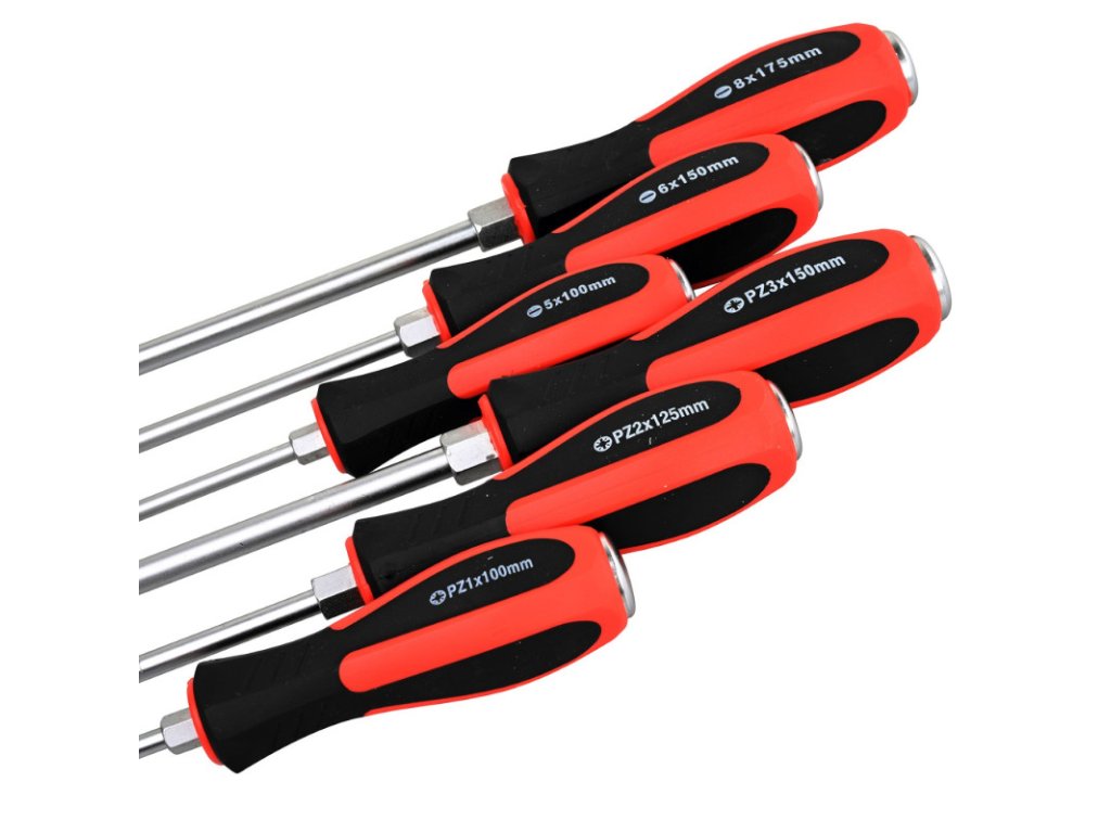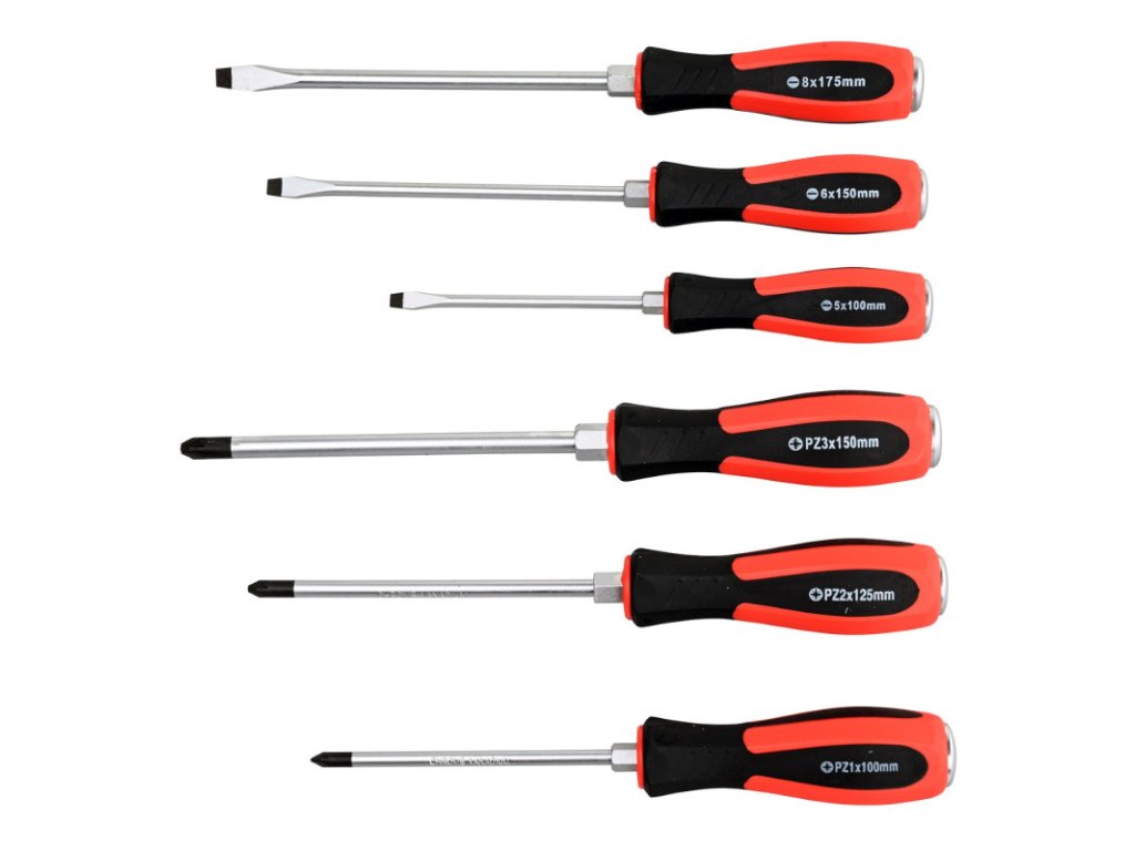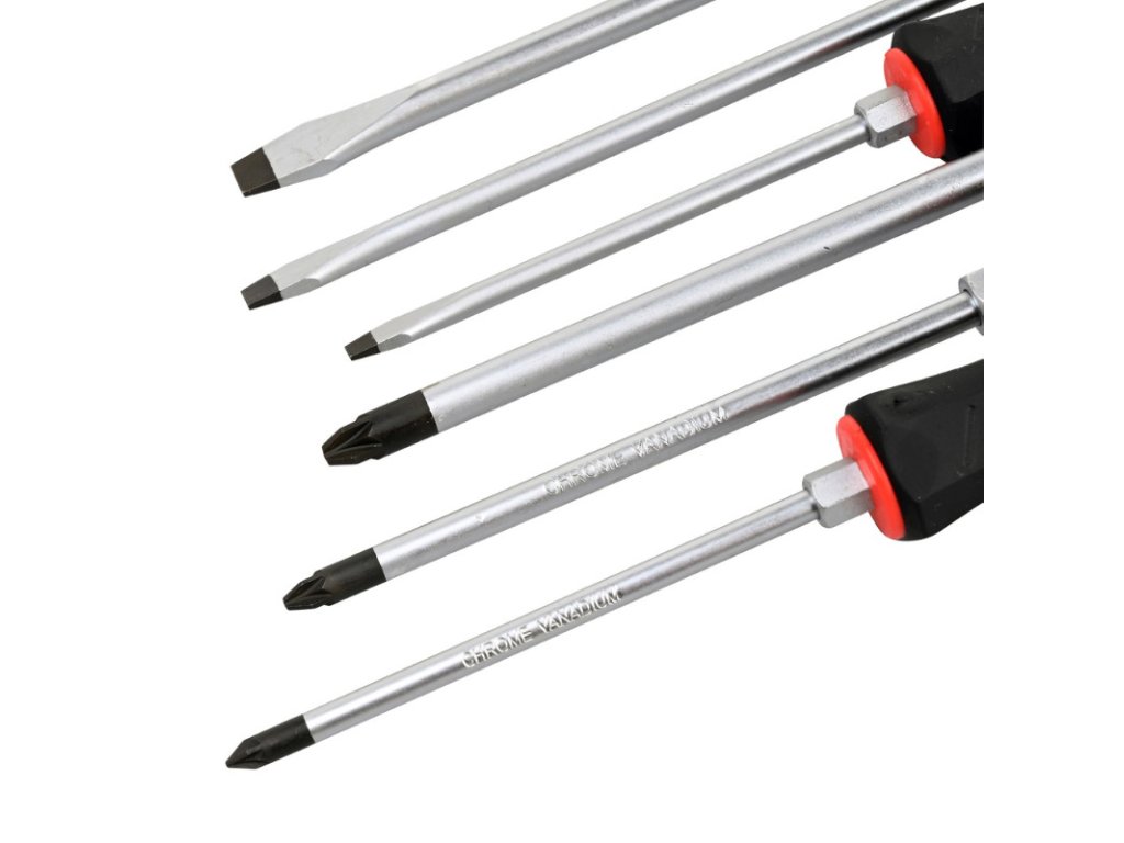 Skrutkovače z vysoko kvalitnej chróm-vanádiovej ocele, čierno brunírované hroty pre maximálnu presnosť sú magnetické, čo výrazne uľahčuje vkladanie skrutiek a zabraňuje ich strate. Ergonomická dvojzložková rukoväť dobre padne do ruky a umožňuje pohodlnú prácu bez únavy. Skrutkovače z vysoko kvalitnej chróm-vanádiovej ocele, čierno brunírované hroty pre maximálnu presnosť sú magnetické, čo výrazne uľahčuje vkladanie skrutiek a zabraňuje ich strate. Ergonomická dvojzložková rukoväť dobre padne do ruky a umožňuje pohodlnú prácu bez únavy. Vďaka integrovanej údernej krytke a šesťhranu na vidlicový kľúč možno na uvoľnenie príliš utiahnutej skrutky použiť kladivo a kľúč. Krížové skrutkovače: PZ1x100 mm / celková dĺžka 190 mm PZ2x125 mm / celková dĺžka 225 mm PZ3x150 mm / celková dĺžka 258 mm Ploché skrutkovače: SL5x100 mm / celková dĺžka 190 mm SL6x150 mm / celková dĺžka 250 mm SL8x175 mm / celková dĺžka 291 mm Driek: chróm-vanádiová oceľ Rukoväť: 2-zložkový plast Farba: čierna, červená Hmotnosť sady: 844 gDoplňkové parametry