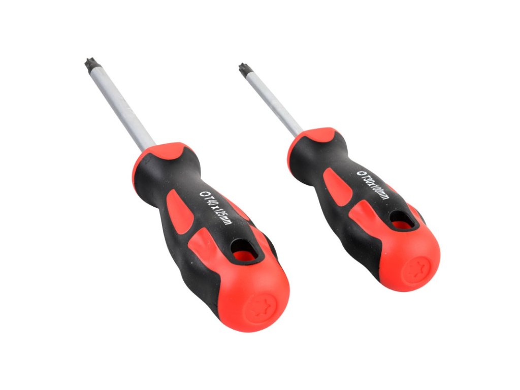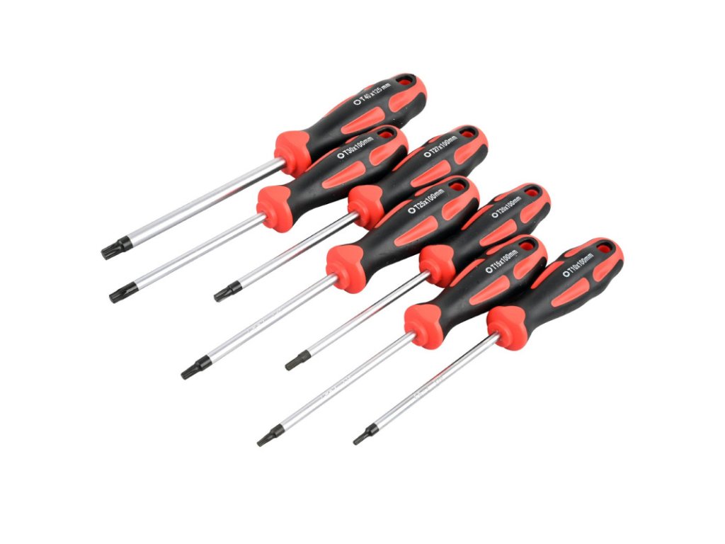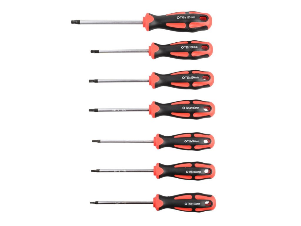 Skrutkovače z vysoko kvalitnej chróm-vanádiovej ocele, čierno brunírované hroty pre maximálnu presnosť sú magnetické, čo výrazne uľahčuje vkladanie skrutiek a zabraňuje ich strate. Ergonomická dvojzložková rukoväť ProLine dobre padne do ruky a umožňuje pohodlnú prácu bez únavy. Skrutkovače z vysoko kvalitnej chróm-vanádiovej ocele, čierno brunírované hroty pre maximálnu presnosť sú magnetické, čo výrazne uľahčuje vkladanie skrutiek a zabraňuje ich strate. Ergonomická dvojzložková rukoväť ProLine dobre padne do ruky a umožňuje pohodlnú prácu bez únavy. Otvor v rukoväti zaisťuje úhľadné zavesenie na stenu s náradím alebo sa dá použiť ako ďalší pákový bod. Skrutkovače Torx: TX10x100 mm / celková dĺžka 200 mm TX15x100 mm / celková dĺžka 200 mm TX20x100 mm / celková dĺžka 200 mm TX25x100 mm / celková dĺžka 210 mm TX27x100 mm / celková dĺžka 210 mm TX30x100 mm / celková dĺžka 210 mm TX40x125 mm / celková dĺžka 245 mm Driek: chróm-vanádiová oceľ Rukoväť: 2-zložkový plast Farba: čierna, červená Hmotnosť sady: 514 gDoplňkové parametry