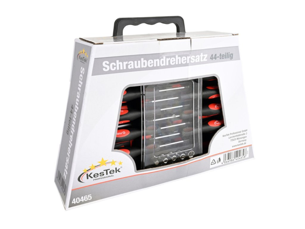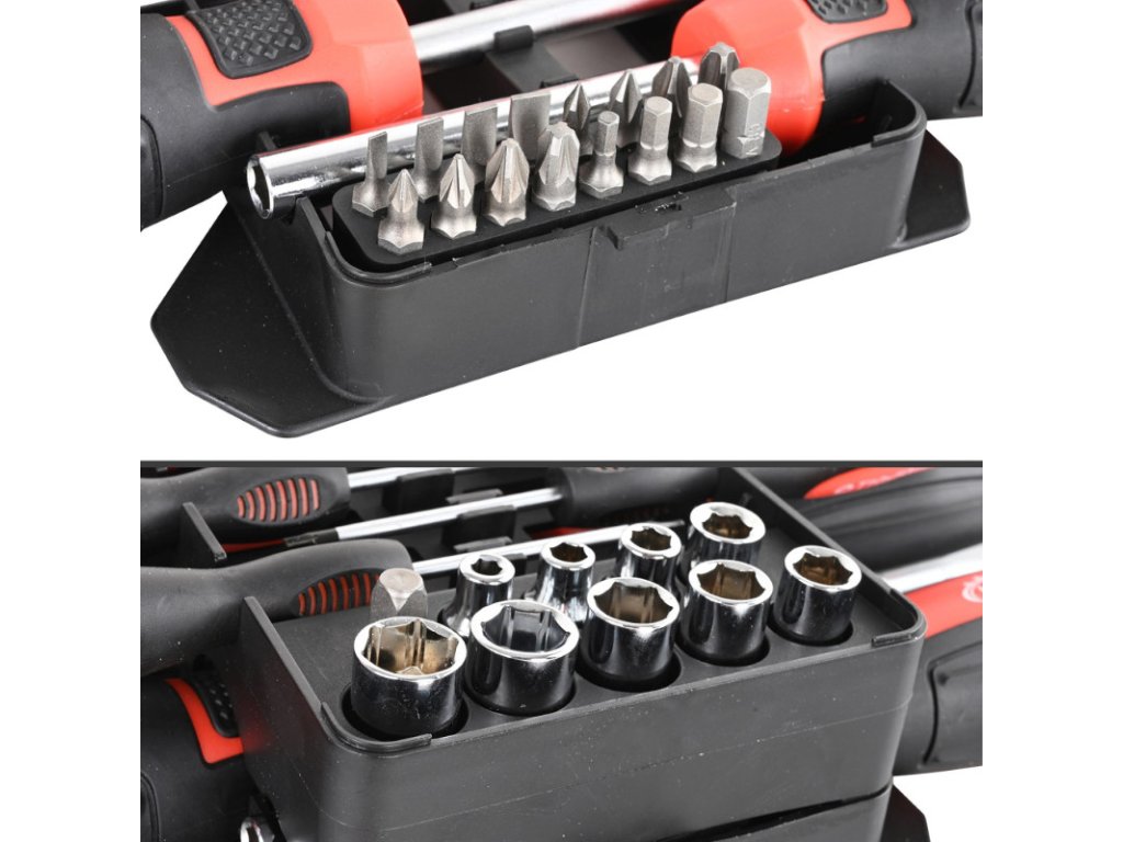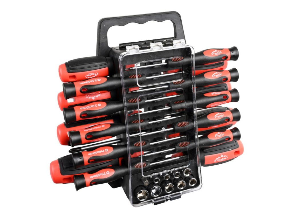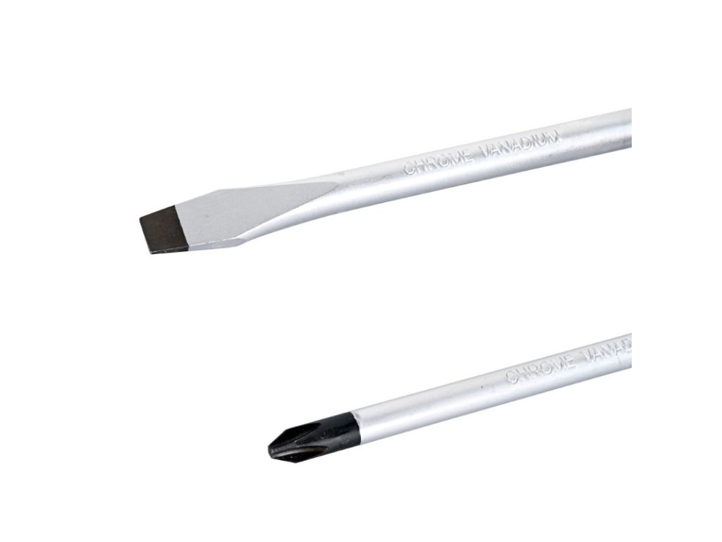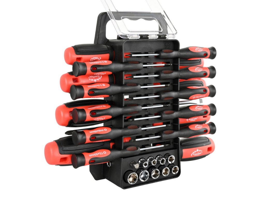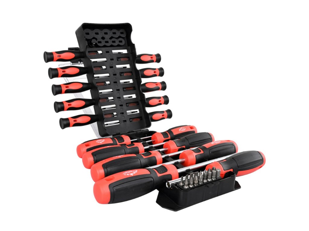 Skrutkovače z vysoko kvalitnej chróm-vanádiovej ocele, čierno brunírované hroty pre maximálnu presnosť sú magnetické, čo výrazne uľahčuje vkladanie skrutiek a zabraňuje ich strate. Ergonomická dvojzložková rukoväť dobre padne do ruky a umožňuje pohodlnú prácu bez únavy. Skrutkovače z vysoko kvalitnej chróm-vanádiovej ocele, čierno brunírované hroty pre maximálnu presnosť sú magnetické, čo výrazne uľahčuje vkladanie skrutiek a zabraňuje ich strate. Ergonomická dvojzložková rukoväť dobre padne do ruky a umožňuje pohodlnú prácu bez únavy. Otvor v rukoväti zaisťuje úhľadné zavesenie na stene s náradím alebo sa dá použiť ako ďalší pákový bod. Skrutkovač na jemnú mechaniku s otočnou opierkou dlane. Uložené v praktickom držiaku na zavesenie. V sade sa nachádza 18 skrutkovačov, 16 bitov, 9 nástrčných kľúčov a 1 adaptér. Krížové skrutkovače: PH0x75 mm / celková dĺžka 165 mm PH1x100 mm / celková dĺžka 200 mm PH2x125 mm / celková dĺžka 235 mm Ploché skrutkovače: SL3x75 mm / celková dĺžka 165 mm SL5x100 mm / celková dĺžka 200 mm SL6x125 mm / celková dĺžka 235 mm SL8x150 mm / celková dĺžka 270 mm Držiak bitov s rukoväťou: magnetický / celková dĺžka 185 mm Skrutkovač na jemnú mechaniku TX: T5, T6, T7, T8, T9, T10 x50 mm / celková dĺžka 145 mm Skrutkovač na jemnú mechaniku SL: 2,5x50 mm, 3,0x50 mm / celková dĺžka 145 mm Skrutkovač na jemnú mechaniku PH: 00x50 mm, 0x50 mm / celková dĺžka 145 mm Adaptér na bity: upínanie 1/4" Šesťhranné nástrčné kľúče: 4, 5, 6, 7, 8, 9, 10, 11, 12 mm Bity: SL3, SL4, SL5, SL6, PH0, PH1, PH2, PH3, PZ0, PZ1, PZ2, PZ3, H3, H4, H5, H6 Driek: chróm-vanádiová oceľ Rukoväť: 2-zložkový plast Farba: čierna, červená Celkové rozmery (DxŠxV): 270 x 240 x 65 mm Hmotnosť sady: 1,281 kgDoplňkové parametry