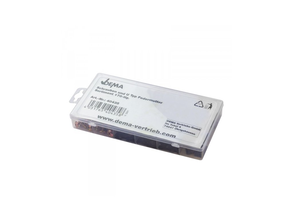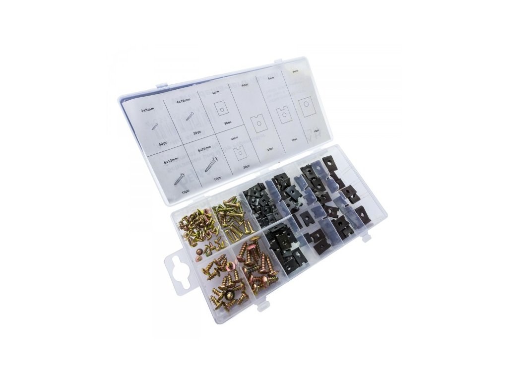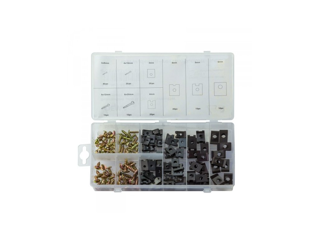 Veľmi užitočná sada na pripevnenie opláštení a clon. Je nenahraditeľným pomocníkom v automobilovom odvetví, pri reštaurovaní a oprave vozidiel. Ku každej perovej matici v tejto sade nájdete vhodnú skrutku. Bežné veľkosti, zobrazenie veľkostí na vnútornom veku. Skrutky a perové matice typu U, 170-dielna sada
