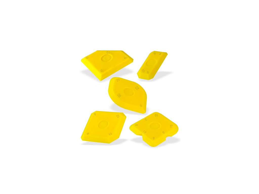 Praktická 5-dielna súprava hladidiel na škáry. Na čisté špárovanie a odstraňovanie silikónových a akrylových hmôt na oknách, obkladoch, dlažbe, prechodoch na podlahe, stene, strope a podobne. Vďaka špeciálnemu tvaru pokrýva takmer všetky oblasti požiadaviek na plochu, rohy a prechody. Odolné voči oderu, veľmi flexibilné a odolné proti kyselinám. Vhodné na veľmi úzke a extra široké škáry.
