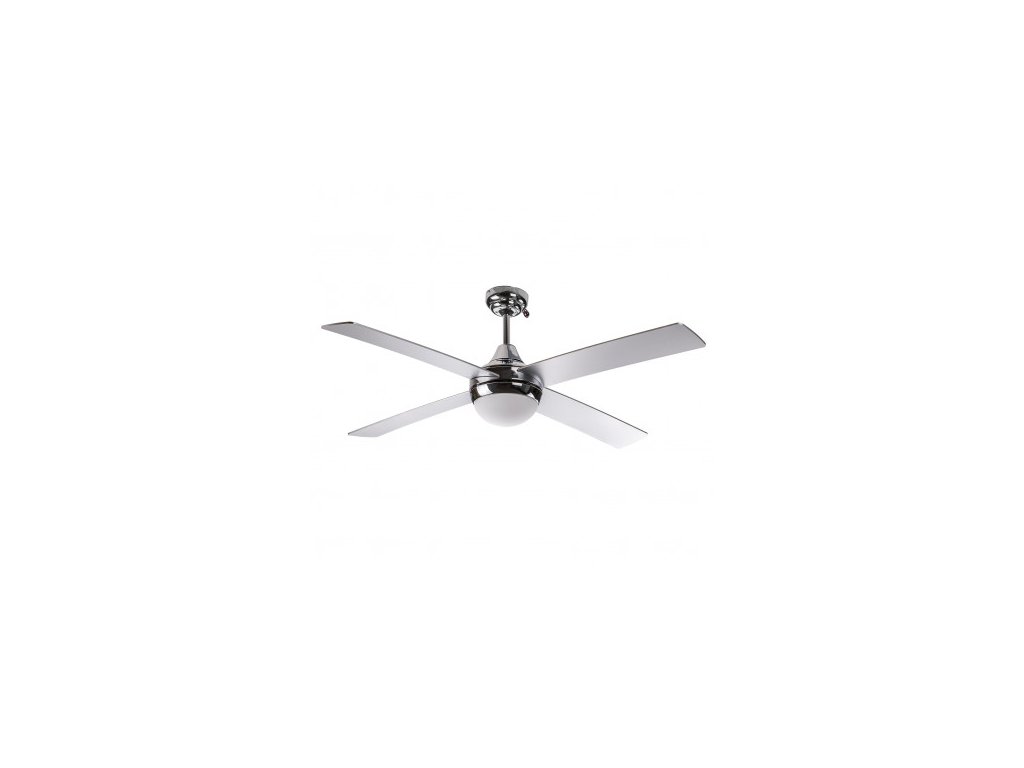 Stropný ventilátor s diaľkovým ovládačom, trojstupňová rýchlosť otáčania s dodatočne nastaviteľnou funkciou časovača, extra zapínateľné osvetlenie a letné/zimné nastavenie prepínateľné na prístroji. Chrómované kovové telo, strieborné lopatky z MDF, satinovaný sklenený kryt lampy. Mimoriadne tichý chod motora s dlhou životnosťou. Infračervené diaľkové ovládanie na prepínanie troch výkonových stupňov, zapnutie a vypnutie svetla a funkcií časovača. Jednoduchá montáž, vrátane spojovacích prvkov, bez svetelného zdroja.
