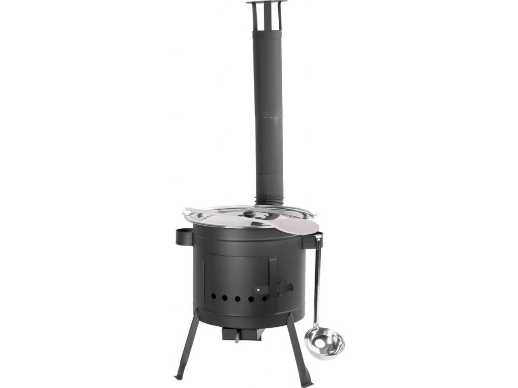 Sada obsahuje: 1 ks železná Párty kotlina (priemer 42 cm, výška 56 cm) so žiaruvzdorným náterom, železná nádoba na popol - 1 ks dvojdielny železný dymovod s priemerom 10 cm, železná strieška, železné koleno - 1 ks nerezový kotlík 22 litrový, 1 ks nerezová pokrievka - 1 ks nerezová naberačka a 1 ks drevená varecha 51 cm.