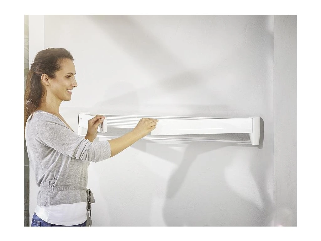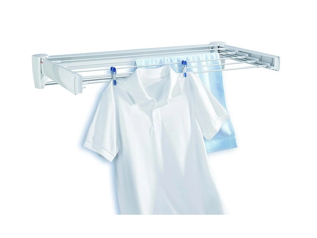 Praktický skladací nástenný sušiak na bielizeň, šetrí miesto, vhodný nielen do kúpeľne, samostatný chrómovaný vešiak na osušky, šírka tyčí 70 cm, 3,6 m sušiacej plochy, záruka 3 roky.
