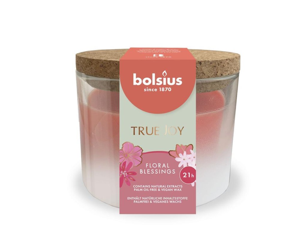 Kolekcia, ktorá šíri čistú radosť. Kolekcia True Joy s prírodnými výťažkami, rastlinným voskom a bez palmového oleja spája krásu prírody prostredníctvom jej farieb, tvarov a vôní. Prebuďte svoje zmysly s vôňou sviečky bolsius True Joy Floral Blessings ! So sviežou jarnou arómou pomaranča, jazmínu a ruže presýtite celú izbu. Sviečka vydrží horieť až 21 hodín.