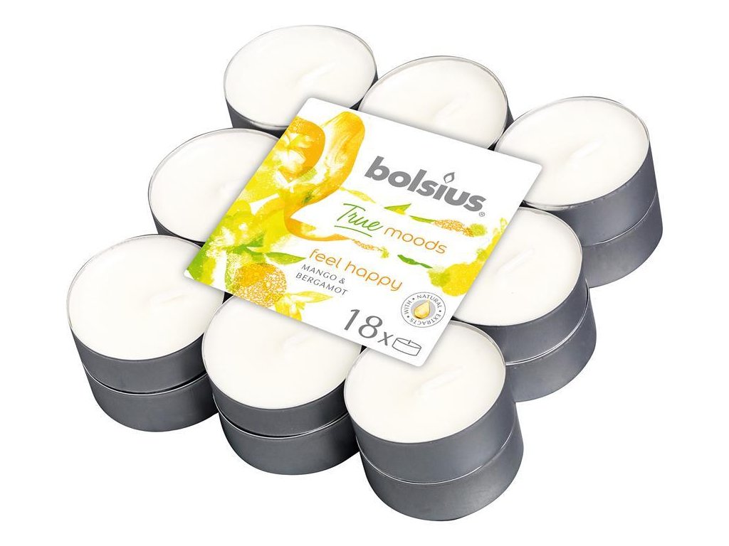 Sviecky bolsius Tealight True Moods, Feel happy (mango a bergamot), bal. 18 ks