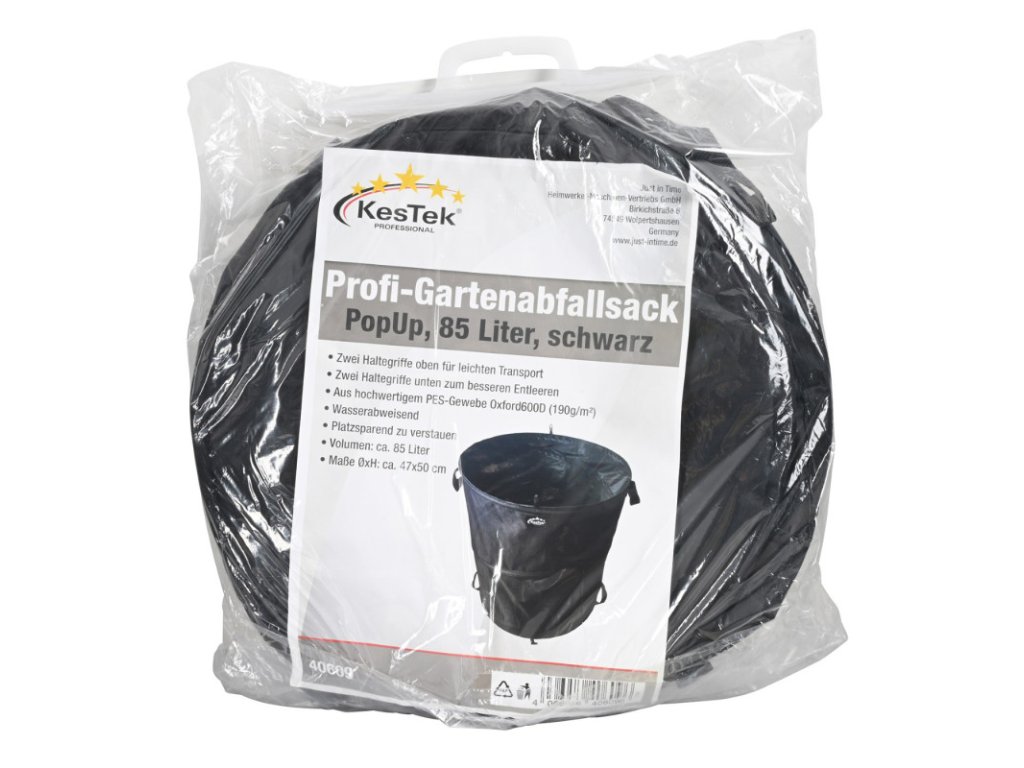 Profesionálne skladacie vrece na záhradný odpad s objemom 85 litrov a štyrmi držadlami. Vďaka bočným popruhom na prenášanie odnesiete pokosenú trávu, burinu, lístie, drvený materiál a iný záhradný odpad do koša na organický odpad alebo do kompostu rýchlo a bez zanechania akýchkoľvek nečistôt. Profesionálne skladacie vrece na záhradný odpad s objemom 85 litrov a štyrmi držadlami. Vďaka bočným popruhom na prenášanie odnesiete pokosenú trávu, burinu, lístie, drvený materiál a iný záhradný odpad do koša na organický odpad alebo do kompostu rýchlo a bez zanechania akýchkoľvek nečistôt. Vhodné aj na prepravu záhradného odpadu do zberného dvora. Pop-up systém zaisťuje, že vak na záhradný odpad stojí samostatne, a tak ho nepotrebujete držať rukou. A keď sa nepoužíva, jeho uskladnenie nezaberie veľa priestoru. Držadlá na jednoduché premiestňovanie a vyprázdňovanie, 2 uzatváracie konzoly s očkom na zavesenie, keď sa nepoužíva. Vyrobené z vysoko kvalitného polyesteru (tkaniny z polyesterových vlákien) Oxford 600D. Odpudzujúce vodu, samostatne stojace vďaka pop-up technológii (všitá a predpätá oceľová pružina), priestorovo úsporné skladovanie. Farba: čierna Materiál: polyester 190 g/m2 Oxford 600D (tkanina z polyesterových vláken) Objem: 85 l Priemer: 470 mm Výška: 500 mm Rozmery v zloženom stave (ØxV): 470 x 80 mm Hmotnosť: 548 gDoplňkové parametry