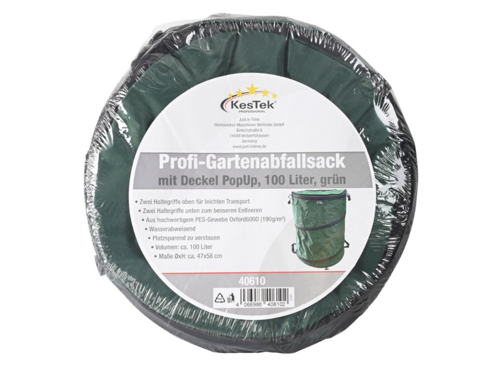 Profesionálne skladacie vrece na záhradný odpad s objemom 100 litrov a štyrmi držadlami. Vďaka bočným popruhom na prenášanie odnesiete pokosenú trávu, burinu, lístie, drvený materiál a iný záhradný odpad do koša na organický odpad alebo do kompostu rýchlo a bez zanechania akýchkoľvek nečistôt. Profesionálne skladacie vrece na záhradný odpad s objemom 100 litrov a štyrmi držadlami. Vďaka bočným popruhom na prenášanie odnesiete pokosenú trávu, burinu, lístie, drvený materiál a iný záhradný odpad do koša na organický odpad alebo do kompostu rýchlo a bez zanechania akýchkoľvek nečistôt. Vhodné aj na prepravu záhradného odpadu do zberného dvora. Veko so zipsom umožňuje bezpečne prepravovať záhradný odpad v aute bez obáv, že vypadne a narobí neporiadok. Pop-up systém zaisťuje, že vak na záhradný odpad stojí samostatne, a tak ho nepotrebujete držať rukou. A keď sa nepoužíva, jeho uskladnenie nezaberie veľa priestoru. Držadlá na jednoduché premiestňovanie a vyprázdňovanie, 2 uzatváracie konzoly s očkom na zavesenie, keď sa nepoužíva. Vyrobené z vysoko kvalitného polyesteru (tkaniny z polyesterových vlákien) Oxford 600D. Odpudzujúce vodu, samostatne stojace vďaka pop-up technológii (všitá a predpätá oceľová pružina), priestorovo úsporné skladovanie. Farba: zelená Materiál: polyester 190 g/m2 Oxford 600D (tkanina z polyesterových vláken) Objem: 100 l Priemer: 470 mm Výška: 580 mm Rozmery v zloženom stave (ØxV): 470 x 80 mm Hmotnosť: 644 gDoplňkové parametry