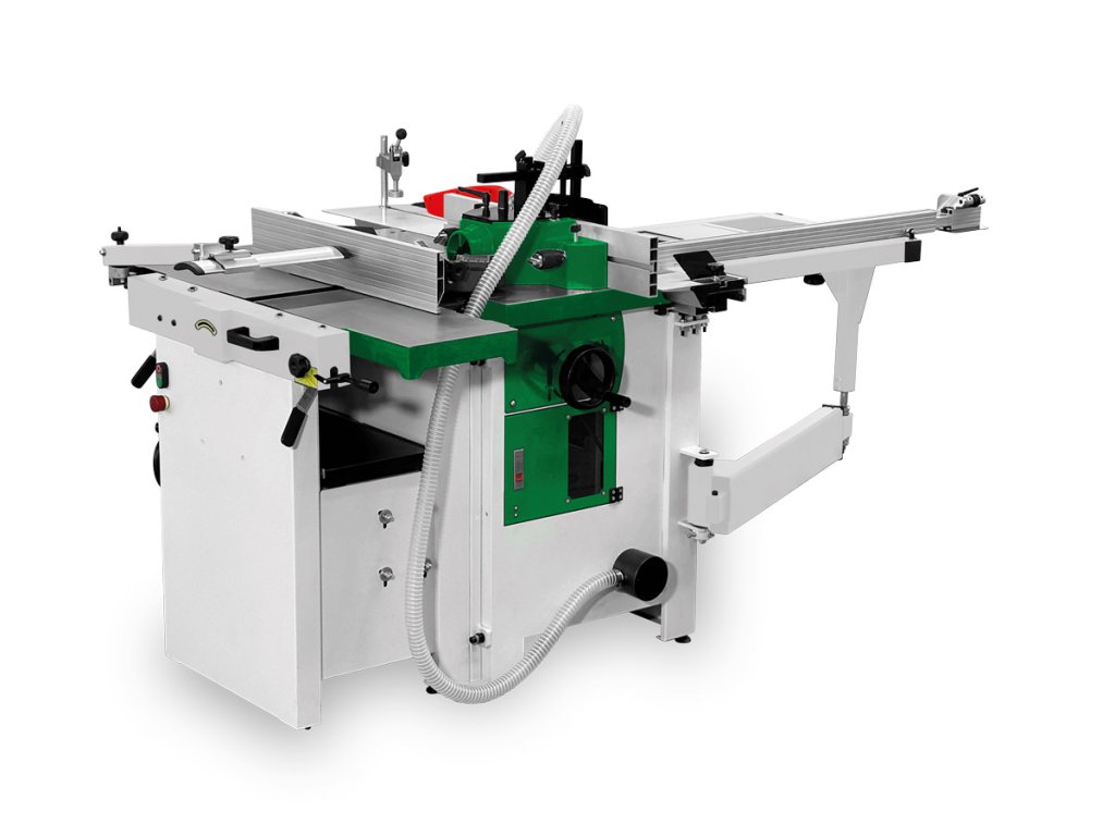 Kombinovaný stroj pro hoblování, řezání, frézování a volitelně s dlabacím zařízením.