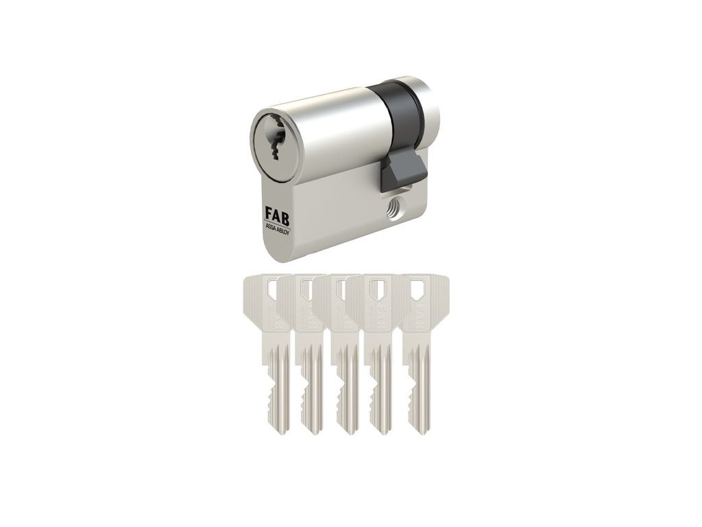 Cylindrická vložka FAB je určená na dvere vyžadujúce trvale vysokú bezpečnosť zaistenia. Vhodné napríklad na vchodové dvere bytového domu, vstupné dvere, kancelárske dvere, školské dvere či na priemyselné objekty. Obsahuje 5 stavítkový uzamykací systém. Ochrana proti odvŕtaniu telesa. Patentované paracentrické profily. Materiál: mosadz, povrchová úprava matný nikel. Štandardne dodávané s 5 predĺženými oceľovými kľúčmi. Rozmer: 30+40 mm.