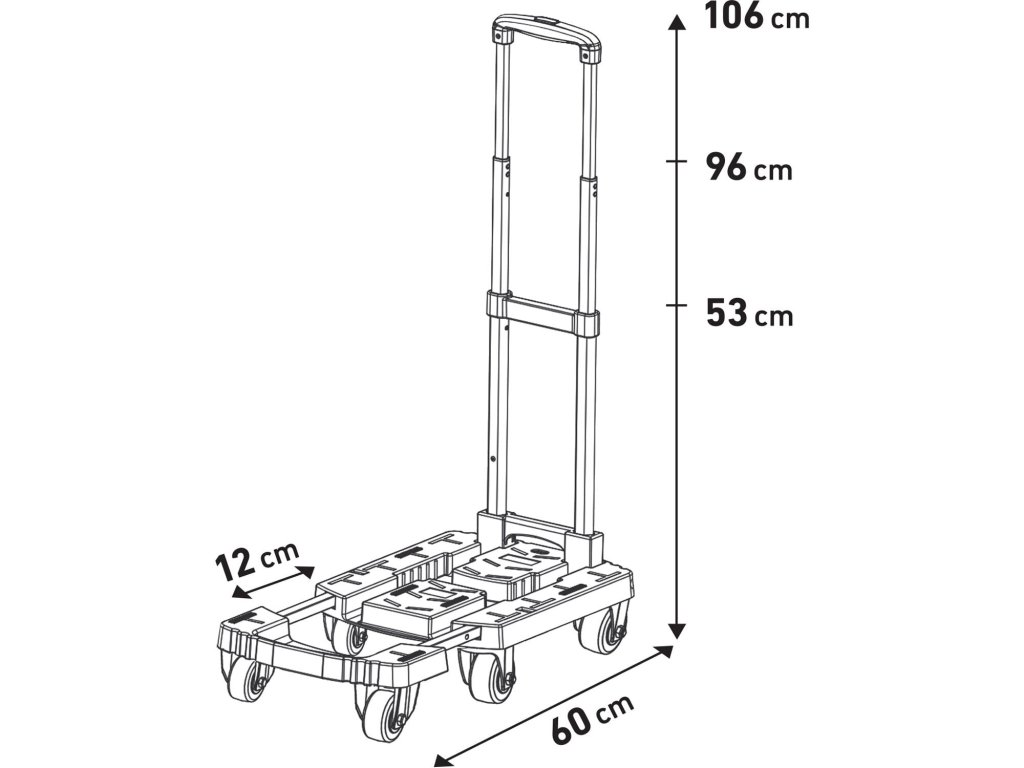 | doplňujúci parameter: | max. nosnosť 200kg, 6 koliesok, nastaviteľná plocha 48-60x32cm, veľkosť v zloženom stave 48x32x11cm, hmotnosť 3,5kg |