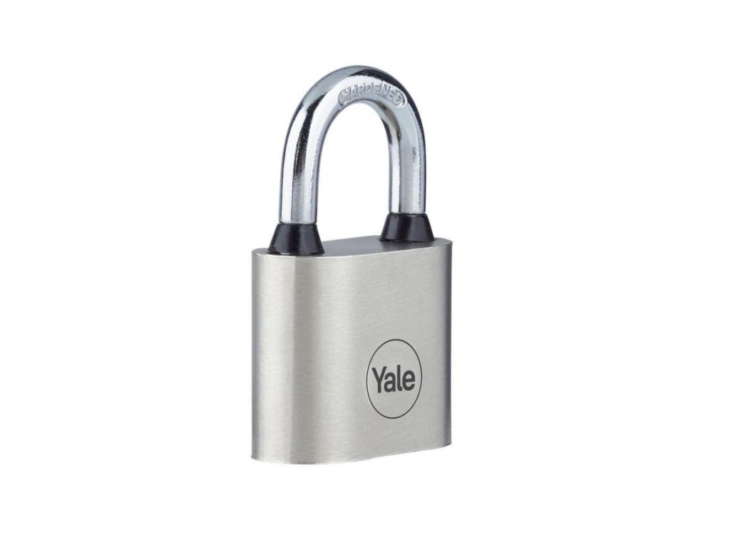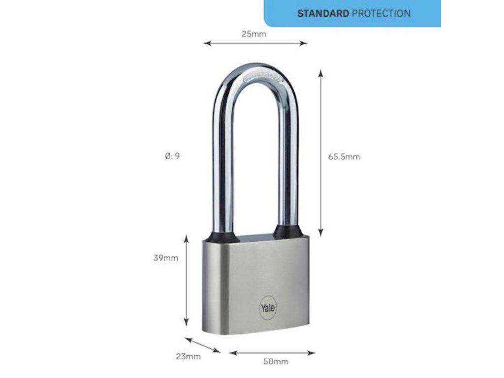 Visiaci zámok Yale so šírkou 50 mm so štandardnou úrovňou zabezpečenia. Železná konštrukcia disponuje tvrdeným strmeňom, ktorý zabraňuje prerezaniu. Odolný zámok testovaný na 10 000 cyklov (otvorenie a zatvorenie) pre optimálny výkon.. Balenie obsahuje 3 ks kľúčov.