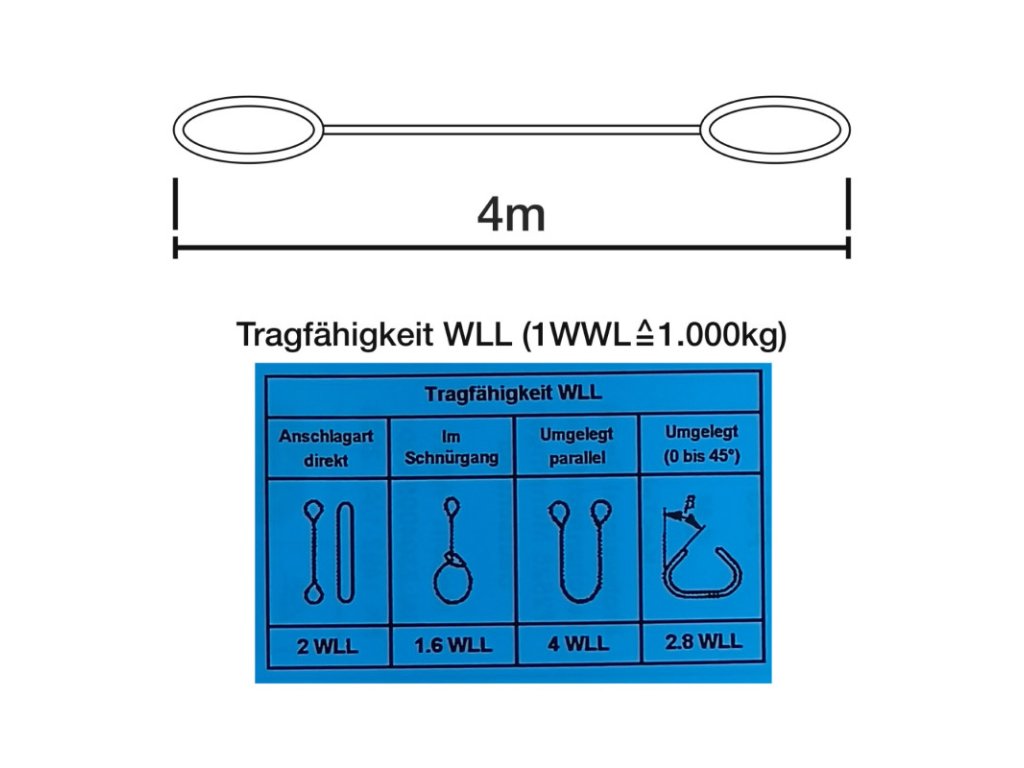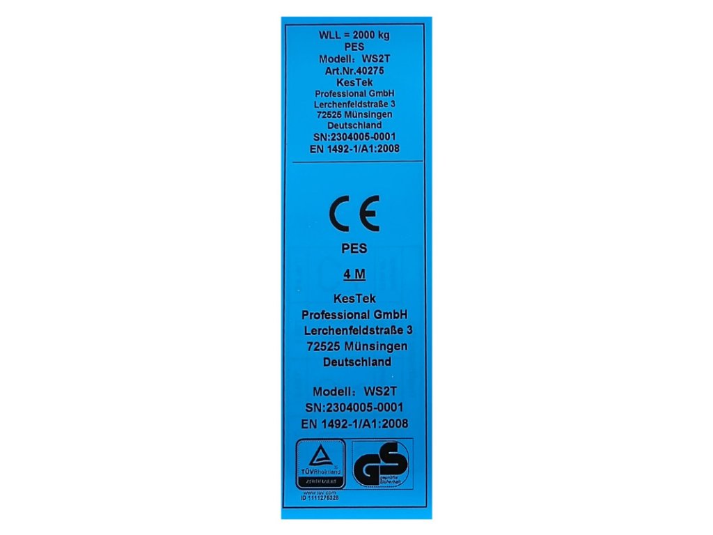 Zdvíhací popruh na zdvíhanie, ťahanie, alebo upevňovanie bremien na staveniskách, v teréne, v domácnosti a podobne. Modrý štítok testovania, všitý identifikačný štítok a návod na použitie. Farebné kódovanie podľa noriem EÚ. Nosnosť WLL 2000 kg (WLL – Working Load Limit) vytlačená na popruhu. Zdvíhací popruh na zdvíhanie, ťahanie, alebo upevňovanie bremien na staveniskách, v teréne, v domácnosti a podobne. Modrý štítok testovania, všitý identifikačný štítok a návod na použitie. Farebné kódovanie podľa noriem EÚ. Nosnosť WLL 2000 kg (WLL – Working Load Limit) vytlačená na popruhu. Popruh vyrobený z vysoko kvalitného polyesteru (PES), zosilnené koncové slučky, široká nosná plocha. Maximálna nosnosť pri priamom zaťažení: 2000 kg Maximálna nosnosť pri slučke: 1600 kg Maximálna nosnosť pri preložení: 4000 kg Maximálna nosnosť pri sklone 0-45°: 2800 kg Farebné kódovanie: zelená GS testované podľa EN1492-1/A1:2008 Šírka popruhu: 60 mm Celková dĺžka: 4 m Hmotnosť: 1,415 kgDoplňkové parametry