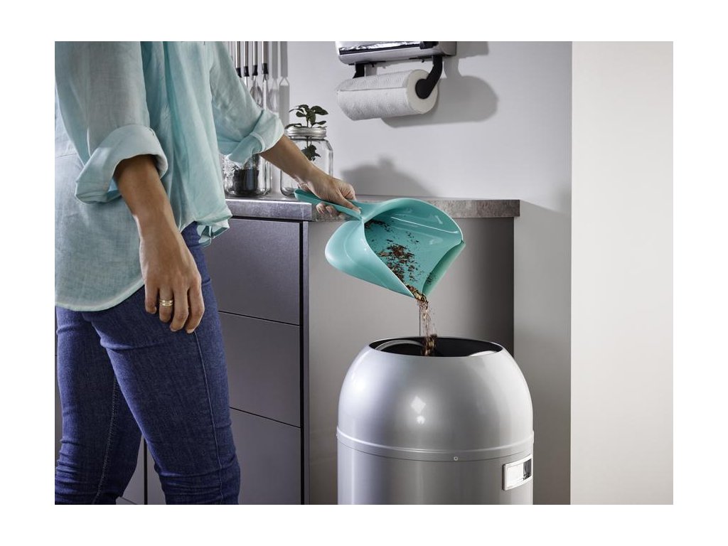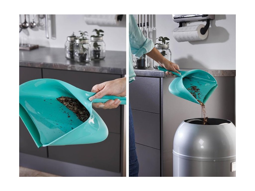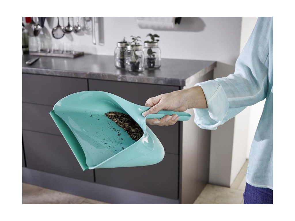 Zmetáčik s lopatkou. Rozmery: 26x30x9 cm. Farba:tyrkysová, materiál:plast.