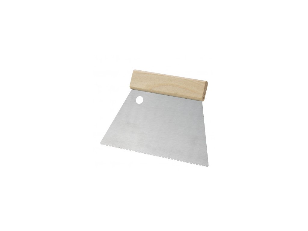 Zúbkovaná stierka na nanášanie lepidiel na obklad, dlažby, lepidiel na podlahové krytiny, malty a omietky. Ergonomicky tvarovaná drevená rukoväť pre pohodlnú prácu, list z leštenej uhlíkovej ocele. S očkom na zavesenie.