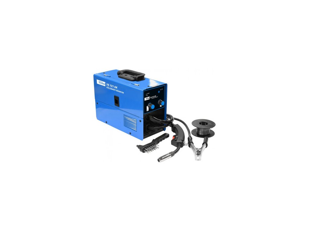 Invertorová zváračka na zváranie trubičkovým drôtom do hrúbky 0,9 mm (malá cievka). Plášť z oceľového plechu s práškovým nástrekom. Tepelná ochrana proti preťaženiu, chladiaci ventilátor, chladenie s núteným obehom. Uzemňovací kábel s ukostrovacou svorkou, hadicové vedenie s priamym pripojením. Zváračka SG 121 AK